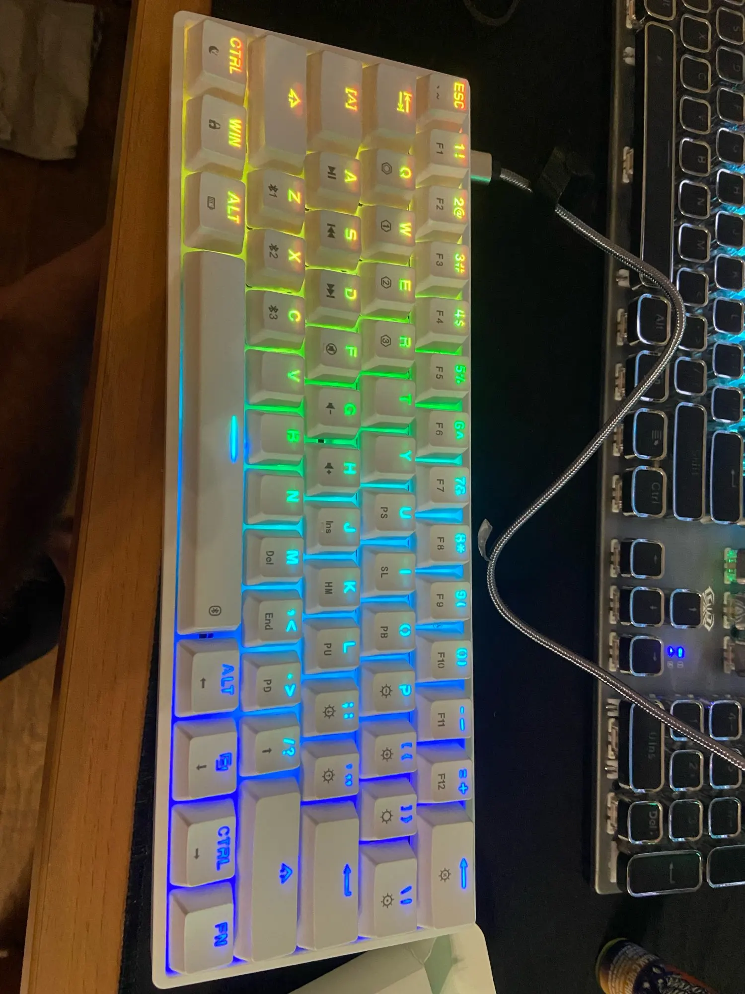 Отличная клавиатура за свою цену(2300Р). Gateron Brown звучат великолепно. Стабилизаторы неплохо смазаны с завода. Есть софт для настройки подсветки, но он требует немного «поломать голову», чтобы разобраться, куда тыкнуть, дабы получить то, что хочешь) Единственный минус, замеченный мной - это подсветка. Если вы хотите установить, к примеру, коричневый цвет на клавиатуре, то вы получите двойной цвет - белый и розовый. Но в целом приятное сочетание цветов настроить все равно можно.