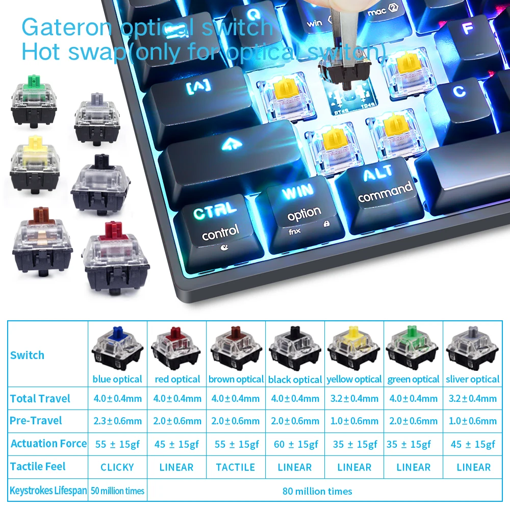 Клавиатура очень хорошая. Я использую клавиатуру вишневого цвета другого бренда с синим переключателем, но оптические переключатели gateron yellow удивили меня отзывчивостью и легкостью при активации. Без сомнения, самая удобная клавиатура, которая используется сегодня.