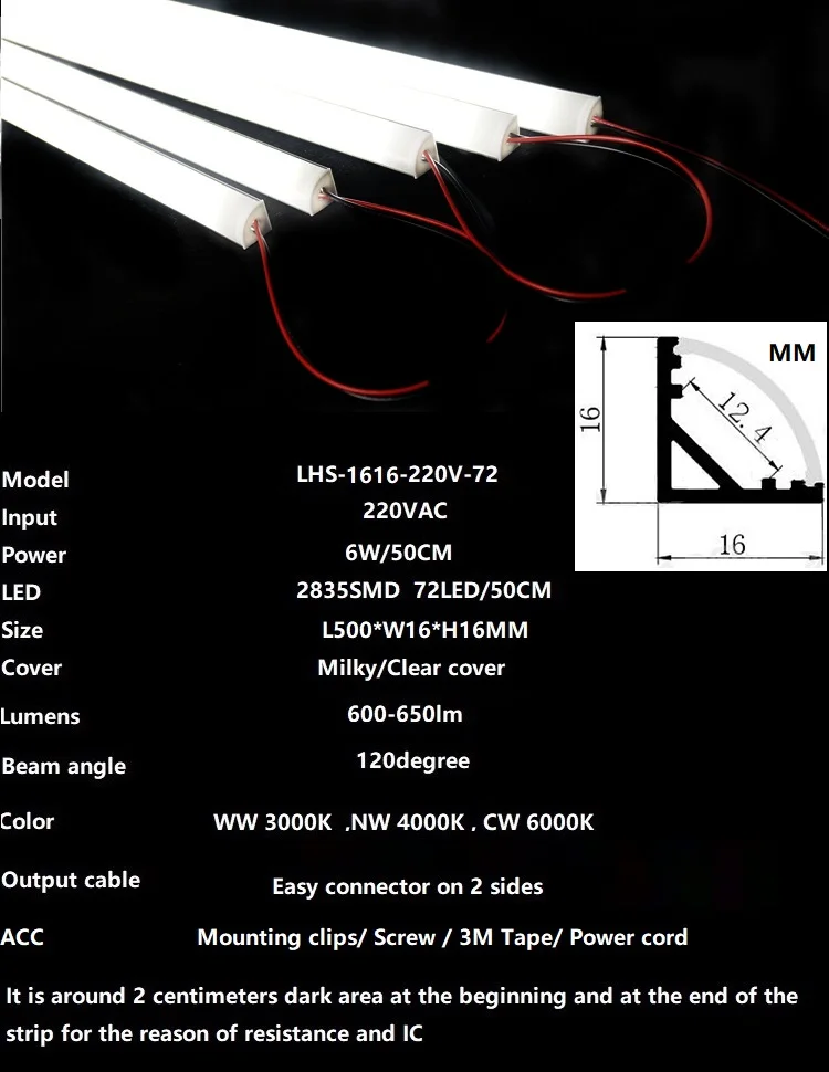 L500 * W16 * H16 ммПолоса 2835 72LED/светильникМощность 6 ВтВход 200-240В переменного токаЛюмен 600-650лмCCT WW3000K,NW 4000K ,CW 6000KКабель 15 смУстановка устанавливается винтом или лентойКорпус алюминиевый канал + крышка ПКСоединитель SM мужской/женский соединительЭто около 2 см темной области в начале и в конце полосыЭто 200-240Vac вход, пожалуйста, не прикасайтесь к печатной плате напрямую, когда питание включено