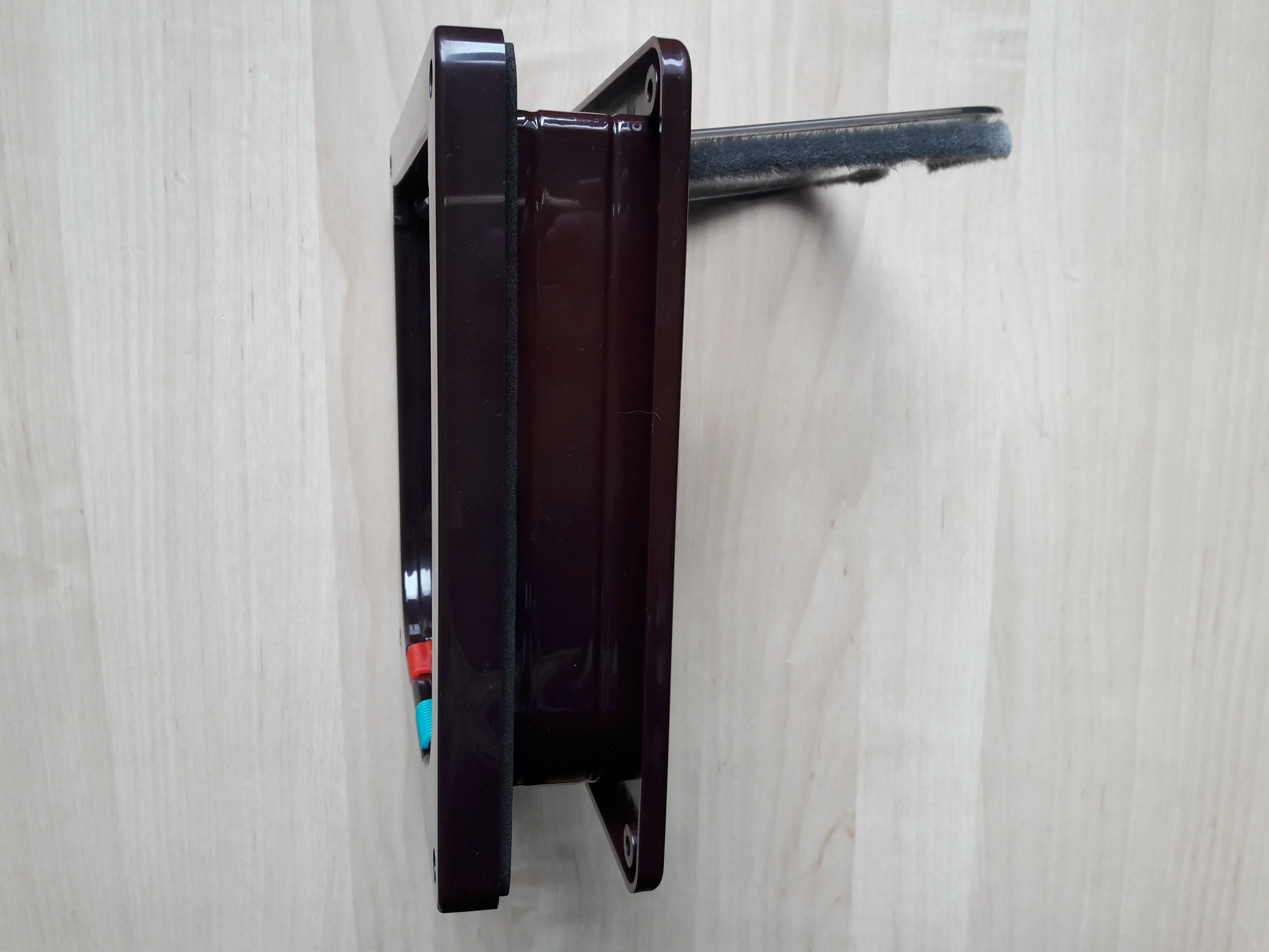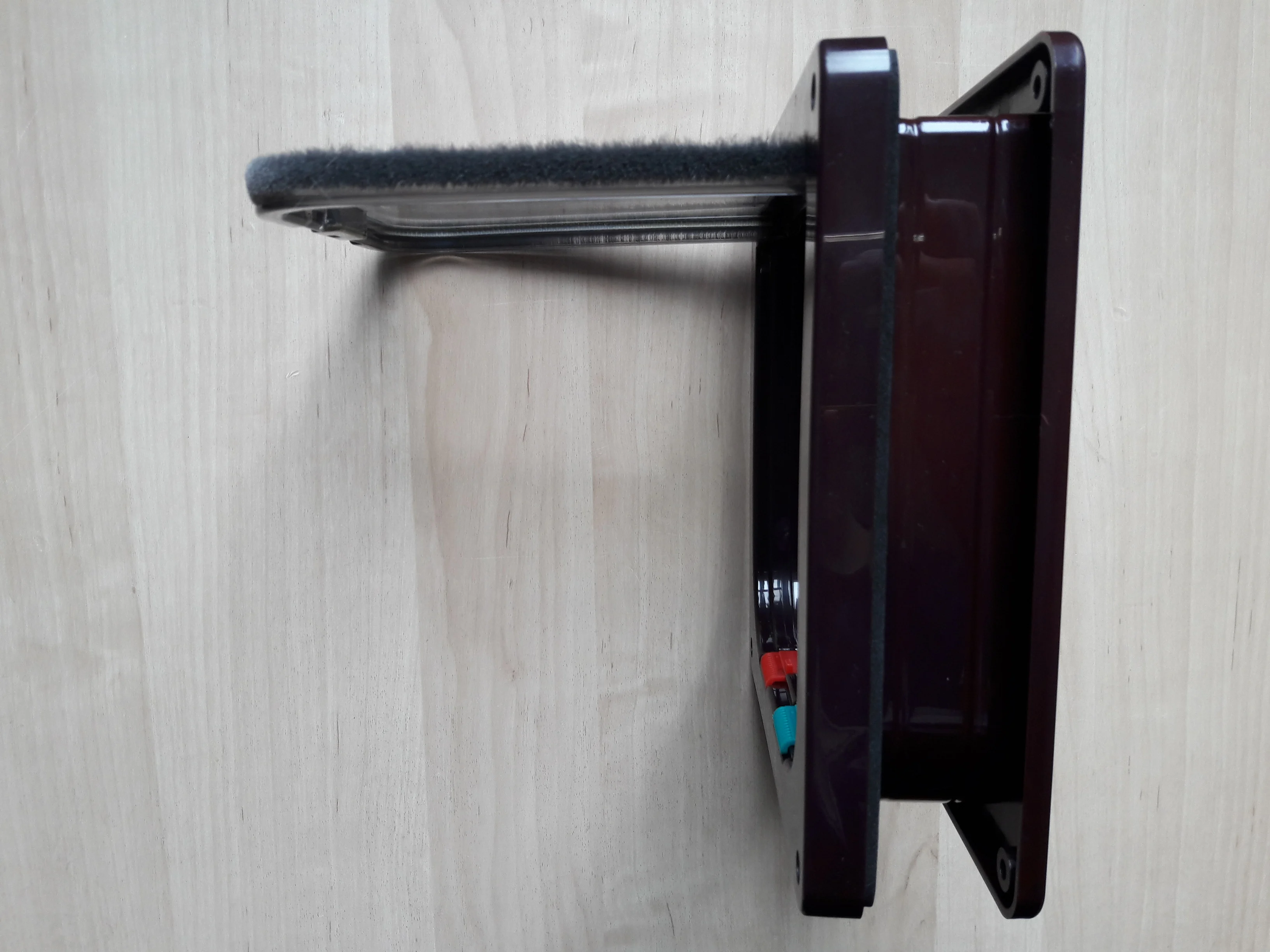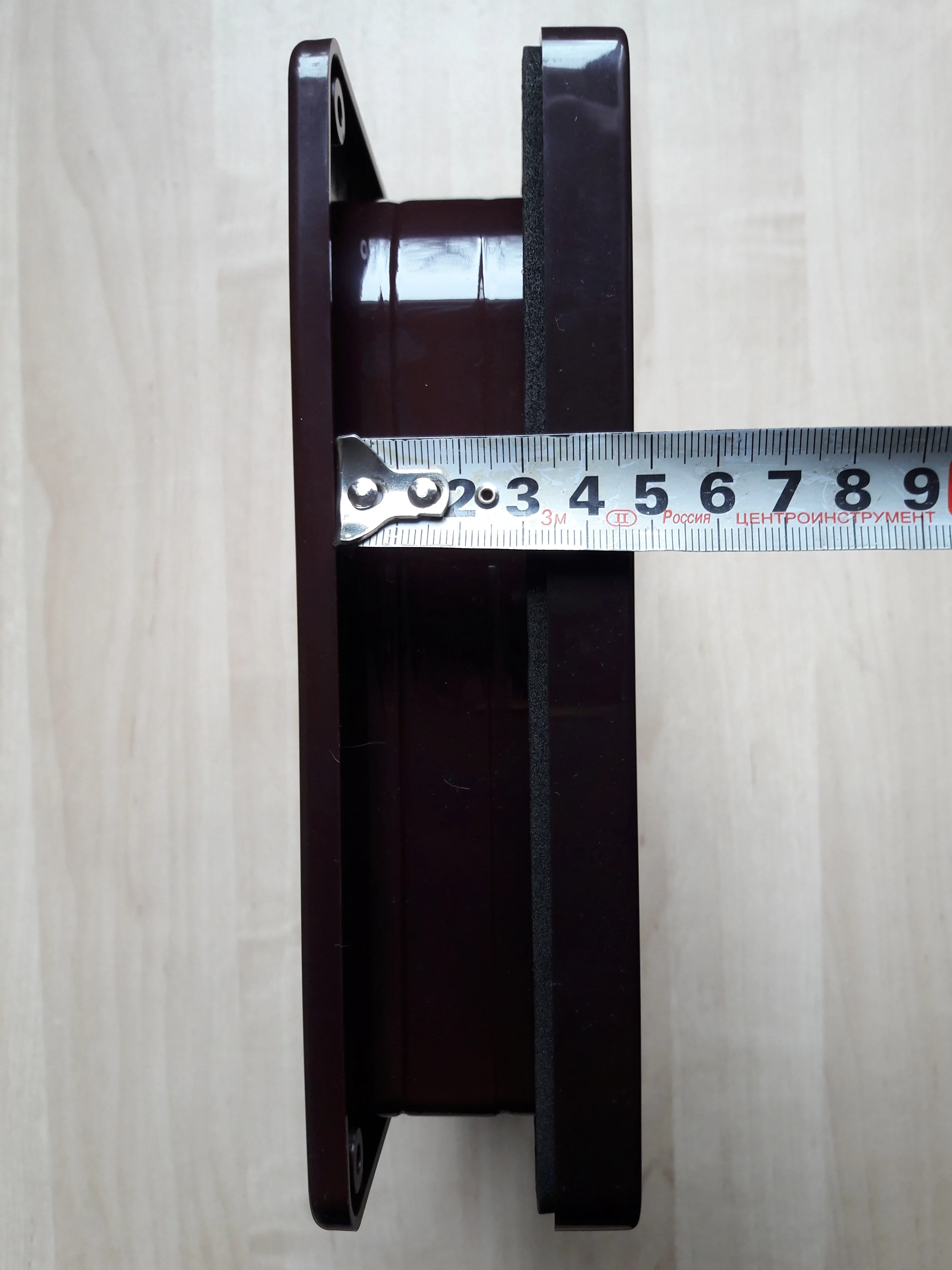 Классная дверка. Купил размер 19.7 x 19 x 5.3 см. Переживал, что взрослый обычный кот не влезет, но коту оказалось даже просторно. Цвет коричневый - не коричневый, а тёмно бордовый. Открывание дверки в одну сторону 90 градусов, в другую чуть больше 90 градусов. Дорого стоит только, но самоделки из смотровых лючков совсем не то.