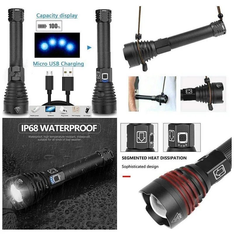 Мощный светодиодный фонарик XLamp XHP90 светодиодный более яркий, чем xhp70 Увеличьте 2*18650 или 2*26650 аккумуляторный отсек, чтобы увеличить время работы. Дисплей емкости аккумулятора, телескопический зум Микро-usb для компьютера usb, Автомобильный USB, usb-разъем для зарядки, зарядный фонарик Изготовлен из авиационного алюминиевого сплава прочный HAIII военный класс Жесткий анодированный Водонепроницаемый в соответствии с IPX-6, водостойкий, может использоваться в дождливую погоду, но не может положить его в воду Подходит для работы, охоты, альпинизма, рыбалки, кемпинга и активного отдыха и т. д. Ударопрочный до 2 метров Храктеристика устройства: Бренд: Абая Модель: мощный фонарик Светильник источника XHP90 Внешний вид цвет: черный XHP90 Размеры: 25,5 см × 6 см × 3,4 см Источник питания для XHP90 : 2x26650 батареи или 2x18650 батареи Способ зарядки: MICRO USB зарядка Вес для XH90: 416 г (без аккумулятора) Материал корпуса: алюминиевый сплав Масштабирование: регулируемый фокус Водонепроницаемый: IPX 6 Режимы переключения (3 режима): сильный-слабый-вспышка Модель: тактический светодиодный фонарь Светильник источник: XHP70.2 / XHP50 Внешний вид цвет: черный XHP70.2 Размеры: 24,8 см × 6 см × 3,3 см XHP50 Размеры: 16,6 см × 4 см × 3,3 см Источник питания для XHP70.2 : 2x26650 батареи или 2x18650 батареи Источник питания для XHP50 : 1x26650 батарея или 1x18650 батарея Время освещения: 2-8 часов Метод зарядки: Прямая зарядка через USB Диапазон: от 200 до 500 метров Водонепроницаемый Рейтинг: IPX-6 Вес для XH70.2: 360 г (без аккумулятора) Вес для XH50: 193 г (без аккумулятора) Материал корпуса: алюминиевый сплав Масштабирование: регулируемый фокус Материал: T6063-T6 авиационный алюминий