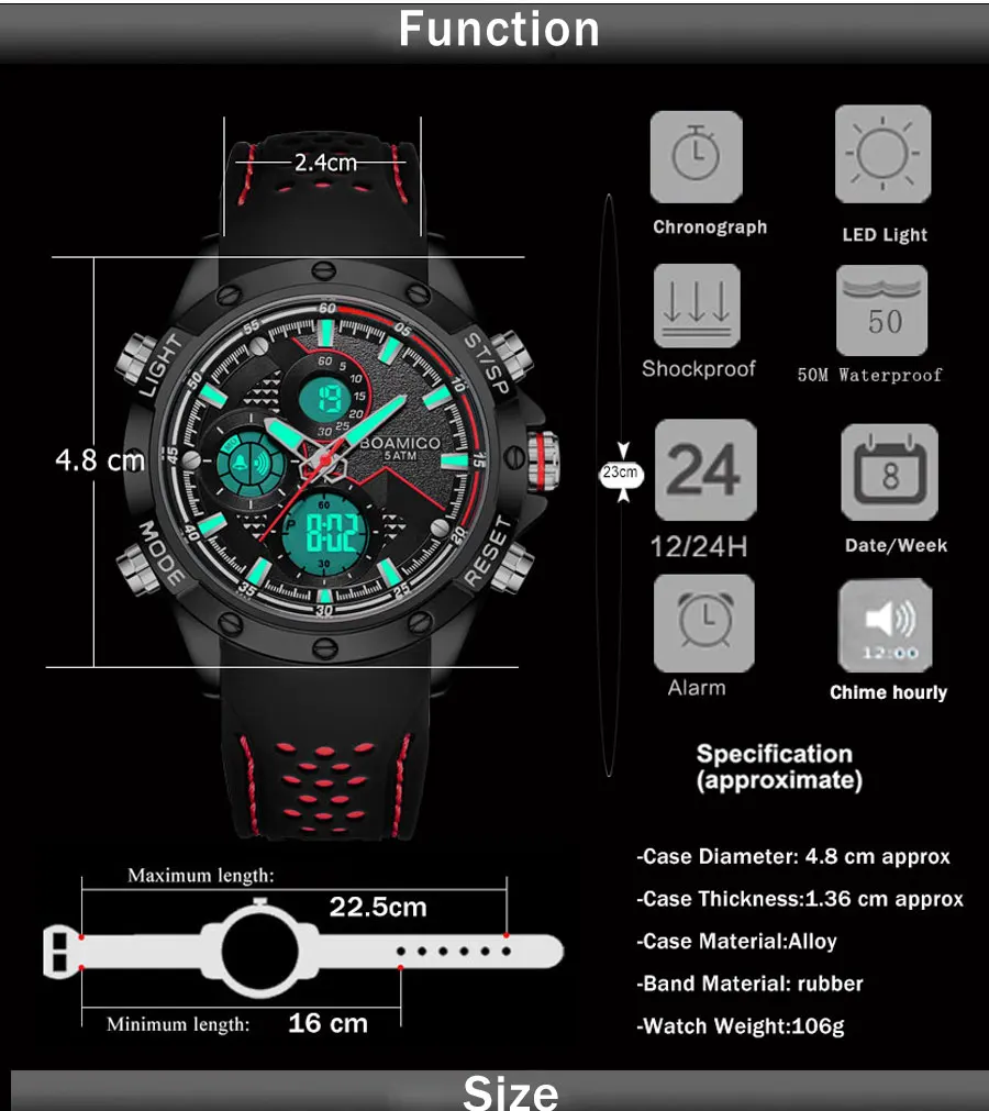 1. Функция: 2 часовых пояса, будильник, ежечасный сигнал, секундомеры, хронограф светодиодный светильник ка, дата, неделя, месяц 2. Идеально подходит для любых деловых, повседневных занятий спортом на открытом воздухе, занятий в помещении или повседневного использования, все маленькие циферблаты рабочие. 3. Механизм: аналоговый цифровой двойной дисплей, японский механизм 4. Материал ремешка: резина 5. Водонепроницаемость 50 М: подходит для всех видов повседневного использования, таких как мытье рук, брызги. (Вы можете плавать с ним в холодной воде за короткое время, но не позволяйте нажимать клавиши под водой) 6. Показывает точное время 7. Хороший подарок на Рождество, Новый Год, день рождения и т. Д.