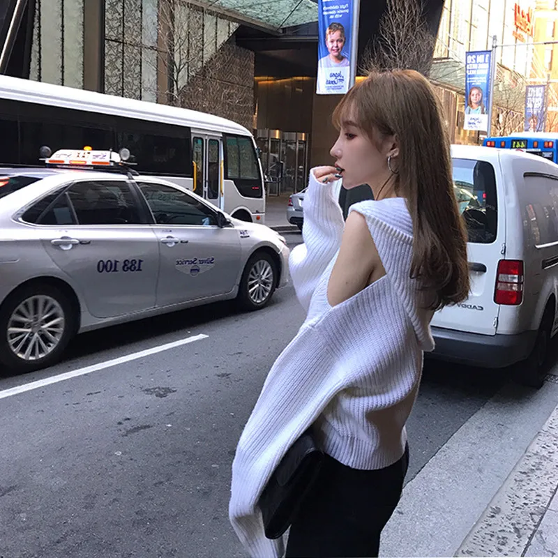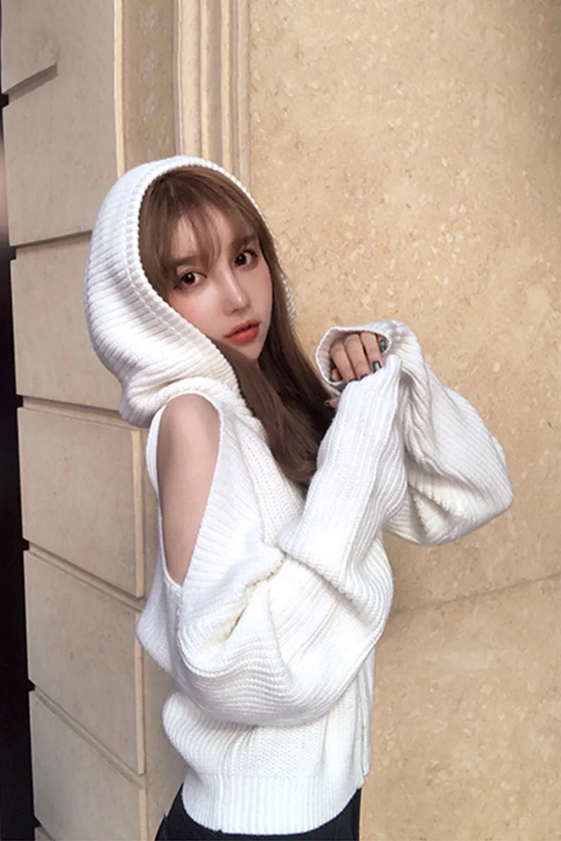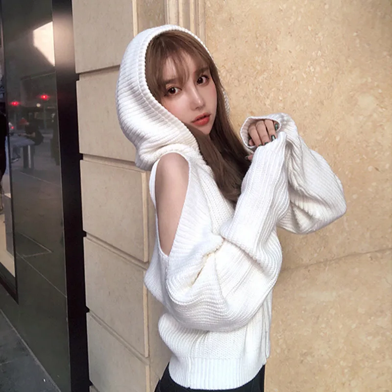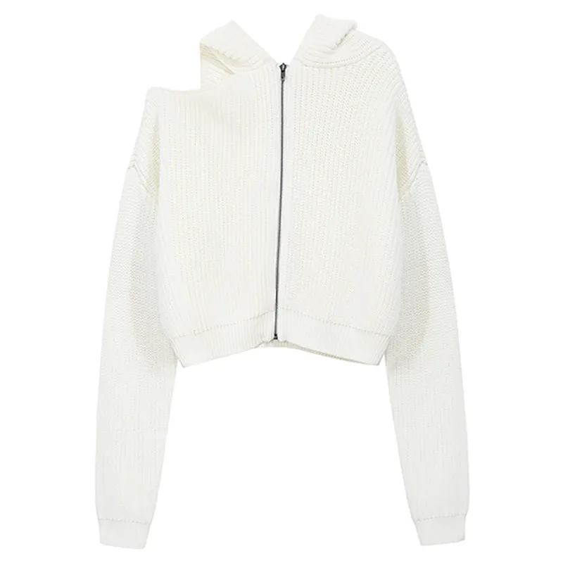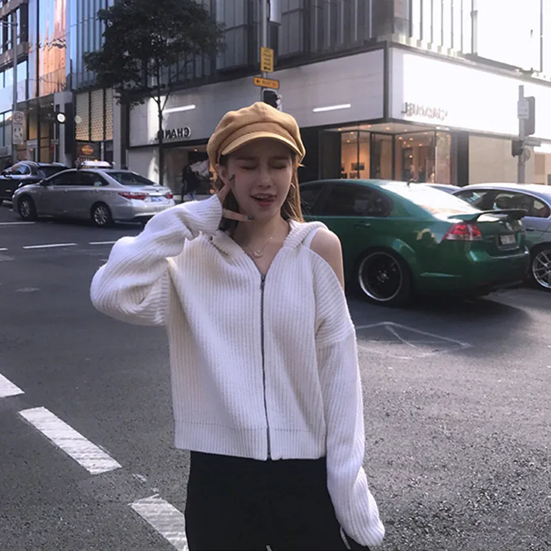 Женский короткий свитер с капюшоном, Белый свободный трикотажный кардиган на молнии с открытыми плечами и длинным рукавом, джемпер в стиле ретро, осень 2020