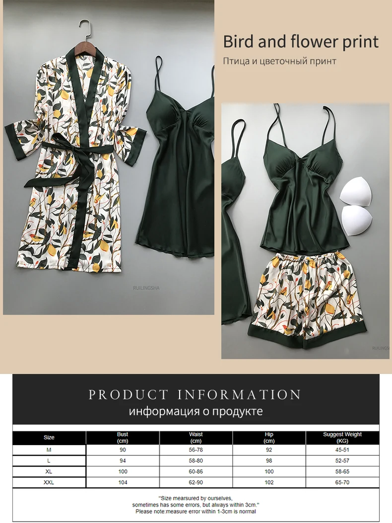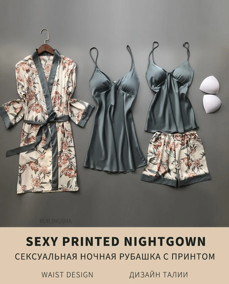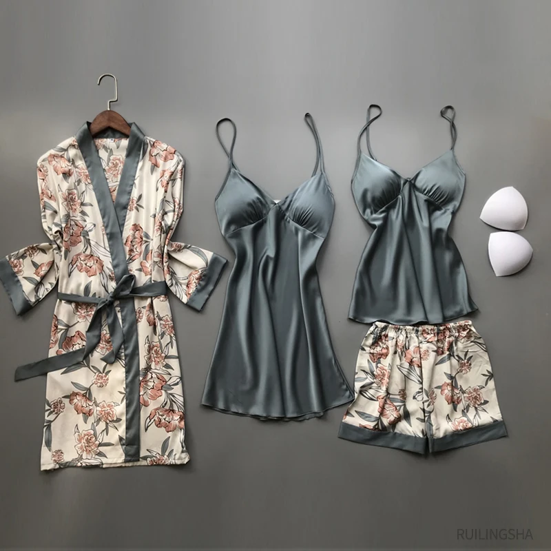 Пижамный комплект женский Шелковый с нагрудными подушечками, одежда для сна с цветочным принтом, комплект из 4 предметов, атласная пижама на бретелях-спагетти, весна-осень 2020