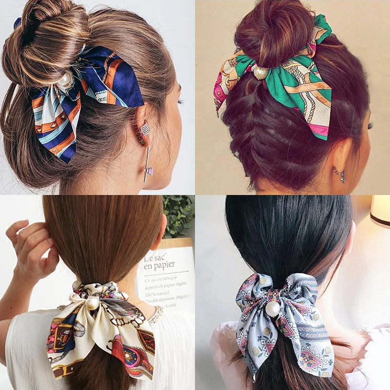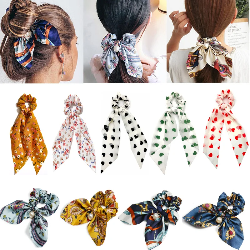 Резинка для волос в стиле бохо Женская, модный винтажный шарф с принтом, лента с жемчугом, шифоновый Шелковый держатель для хвоста, аксессуар для волос с узлом