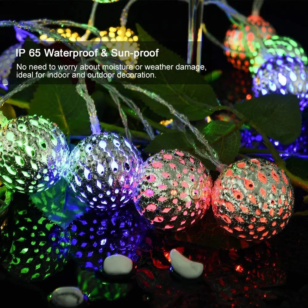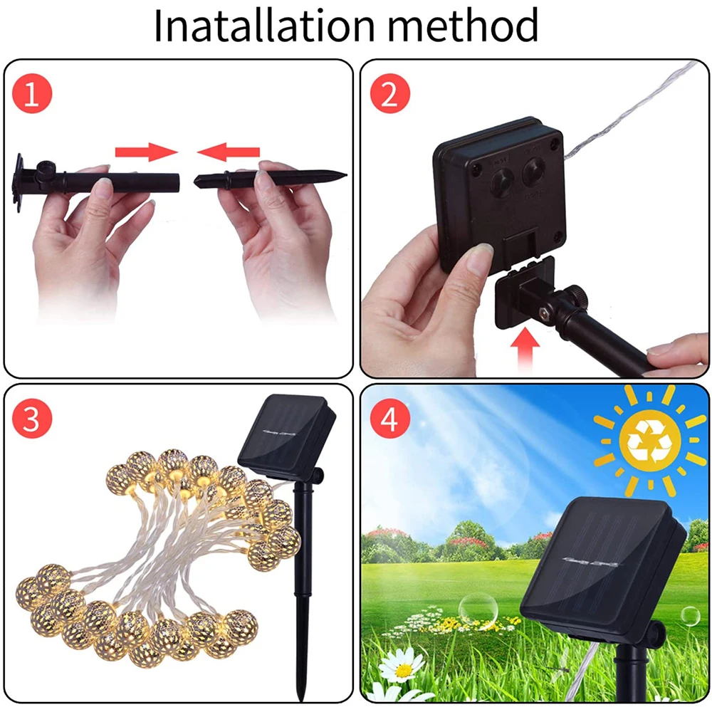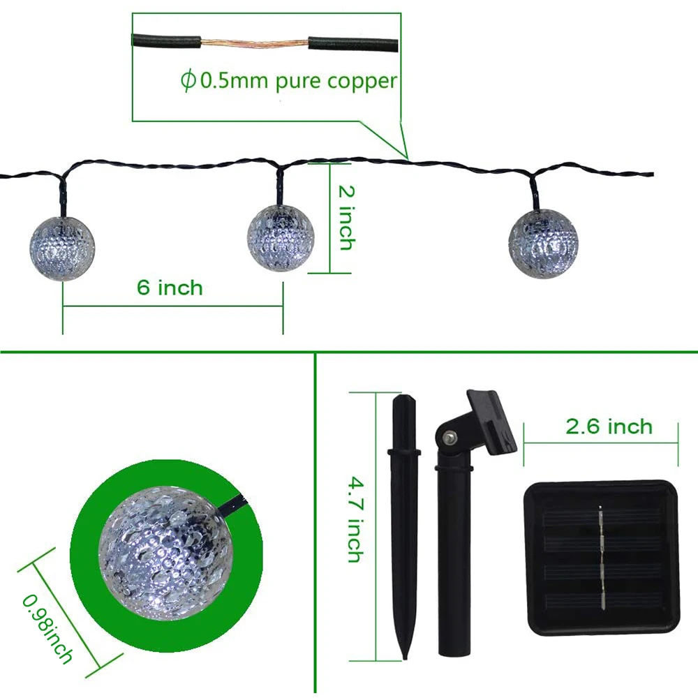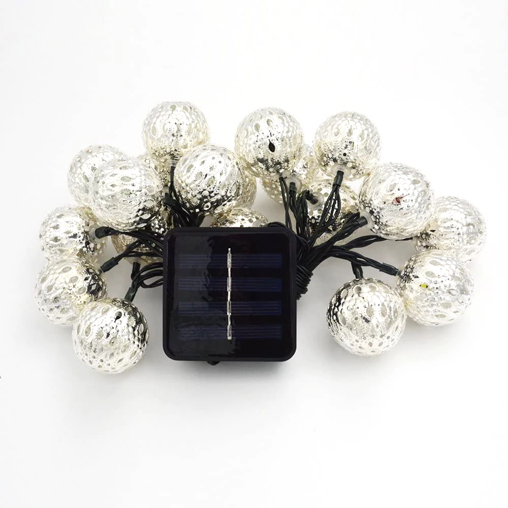 Светильник Цвет: белый/теплый белый/многоцветныйОсобенностиПервый светодиодный свет к блоку управления Расстояние 1,5 м, длина линии 0,152 М.Преобразует солнечную энергию в электричество, не загрязняет окружающую среду, просто достаточно ярко, чтобы не раздражать ваши глаза.Экологически чистые продукты, высокая скорость преобразования энергии.Солнечные гирлянды используются в дороге, дворе, окнах, магазинах, холле, сцене, особенно в качестве украшения рождественской елки, создавая теплую и романтическую атмосферу.С 20 Вт, 30 Вт, 50/100 специальный шар марокканский шар света Строка Светодиодный свет.Спецификация:Цвет: серебристыйМатериал: металлМощность: солнечная энергия edСолнечная панель: 2 в/100 мААккумулятор: 1 * ni-mh аккумулятор, 600 мАч (не включая)Светодиодный Количество: 20 Вт, 30 Вт, 50/100 штДлина провода: 5/6.5/7/12Диаметр шарика: прибл. 2,5 см/0,99 дюймаПереключатель: включение/выключение питания и режимСветильник режима: горит постоянно и флэш-памяти; Восемь виды режим автоматически преобразует (нужно вручную нажмите переключатель режима для того, чтобы перевести светильник режим)Советы:1. Если земля слишком жесткая, Не крутите и не молотьте ее силой. Попробуйте смягчить землю водой, а затем вставить в землю. Невыполнение этого требования может привести к повреждению продукта.2. Рекомендуется полностью заряжать солнечную панель за 6 ч при первом использовании.3. Поверните светильник и установить светильник режим перед зарядкой солнечной энергии, поэтому он будет светильник в сумерках.4. Свет может ржаветь снаружи, но это не повлияет на внешний вид в ночное времяПосылка включает в себя:1 x солнечная панель с подставкой1 x марокканские шаровые гирлянды