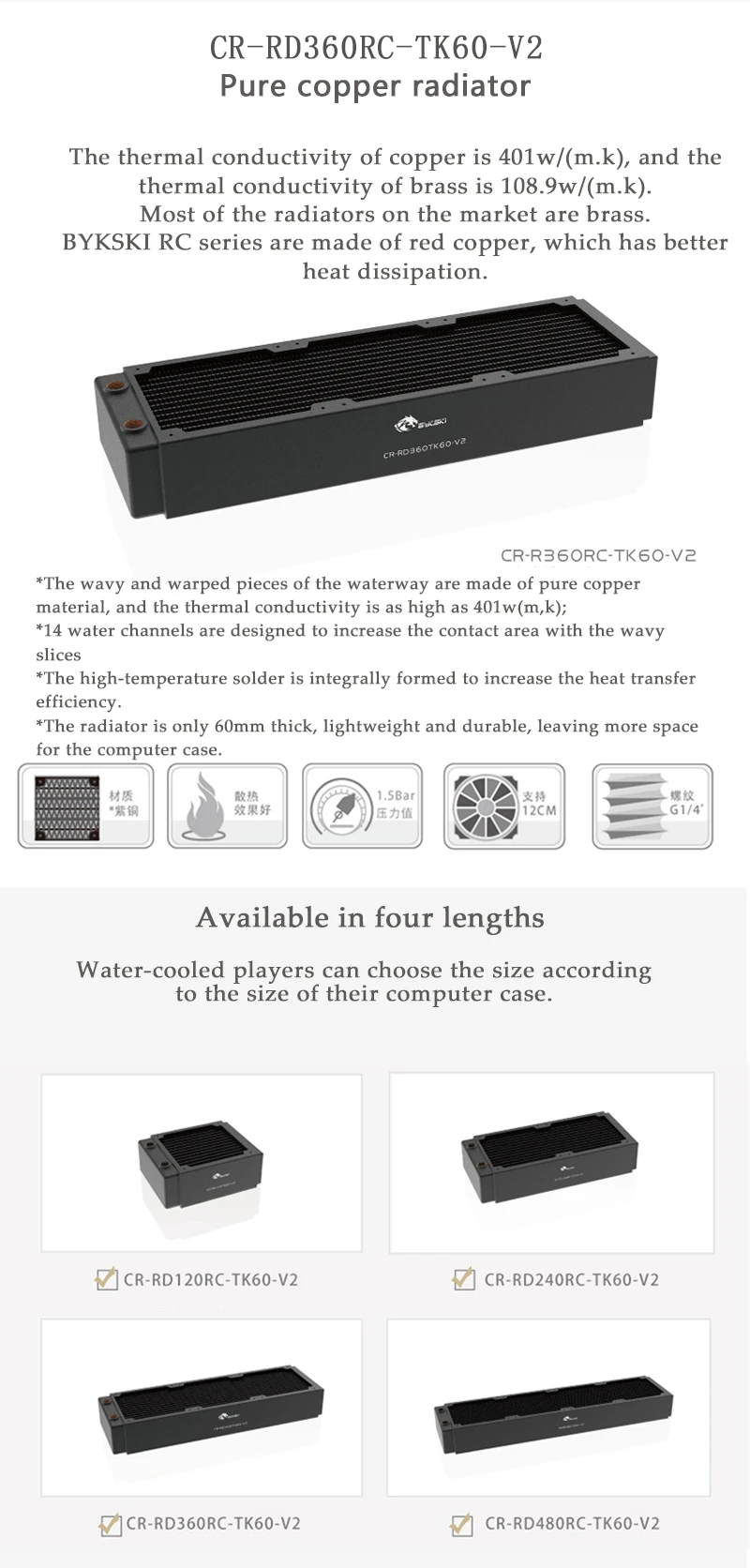 Медный радиатор BYKSKI 480 мм для охлаждения ПК, толщина 60 мм для ...