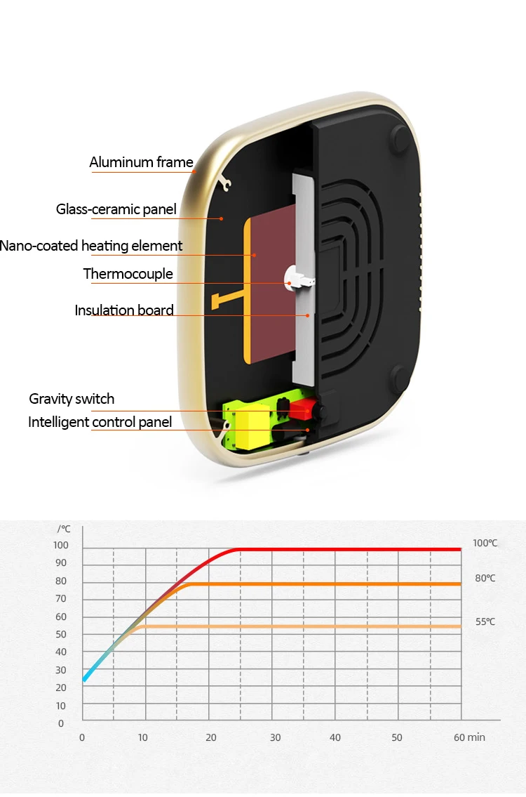 Качество изготовления (стекло варочной поверхности, пластиковый ободок по периметру) очень высокое. Вещица компактная, но очень увесистая, производит впечатление дорогого изделия. Вилка в комплекте плоская, но продавец любезно вложил евро-адаптер. Нагревательный элемент галогенный, достаточно мощный, турка с кофе (150 мл) закипела за 5 минут - брал специально для заваривания кофе по-турецки. С этой задачей плитка справилась на отлично. Для заваривания чая и просто подогрева любой жидкости небольшого объёма также идеально подойдёт. Управление простое - одной механической кнопкой, индикация температуры (55, 80 и 100) высвечивается на стеклянной панели. Рекомендую товар и продавца.