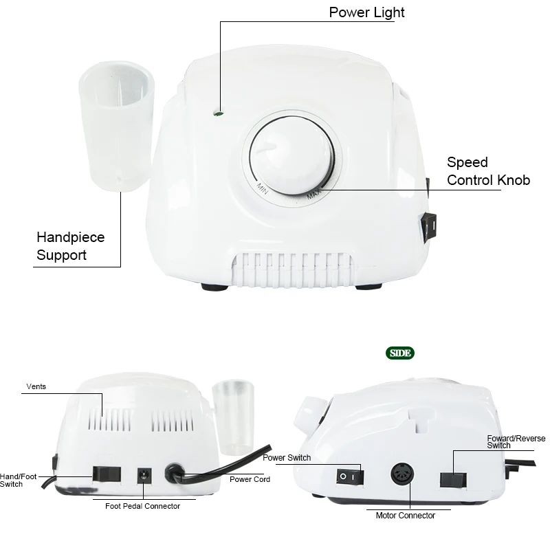 Блок управления и микро-мотор Руководство пользователя ※ Перед началом эксплуатации Обязательно прочитайте это руководство. Model Модель: Чемпион/(сильный 120N Handplece) Escor 1. Предостережение -Установите устройство на рабочем месте и не используйте его в грязном или очень горячем и влажном месте. (-20 ℃ ~ 40 C, 0 ~ 90% RH) -Пожалуйста, будьте осторожны, чтобы не уронить наконечник. Это повредит шариковый подшипник или уменьшит прочность двигателя. -Пожалуйста, не допускайте попадания воды или других жидкостей на наконечник и блок управления. -После замены bur, пожалуйста, убедитесь, что закрыть патрон ручки ohro также, не открывать патрон ручки, в то время как наконечник работает. -В то время как наконечник не работает, рекомендуется держать Бур в патроне коллета после очистки -Пожалуйста, подключите шнур питания после проверки питания блока. Этот аппарат предназначен для стоматологической лабораторной работы, ухода за ногтями и других буровых работ -Он используется только для специалистов, которые обучены электрическим микро-двигателем. Посылка включает в себя: 1 х блок управления 1 х 120 35 об/мин наконечник Силиконовая подставка-1 шт. 1x контроллер для ног 2x запасная Угольная щетка 1 гаечный ключ 1x Руководство пользователя Упаковочная коробка