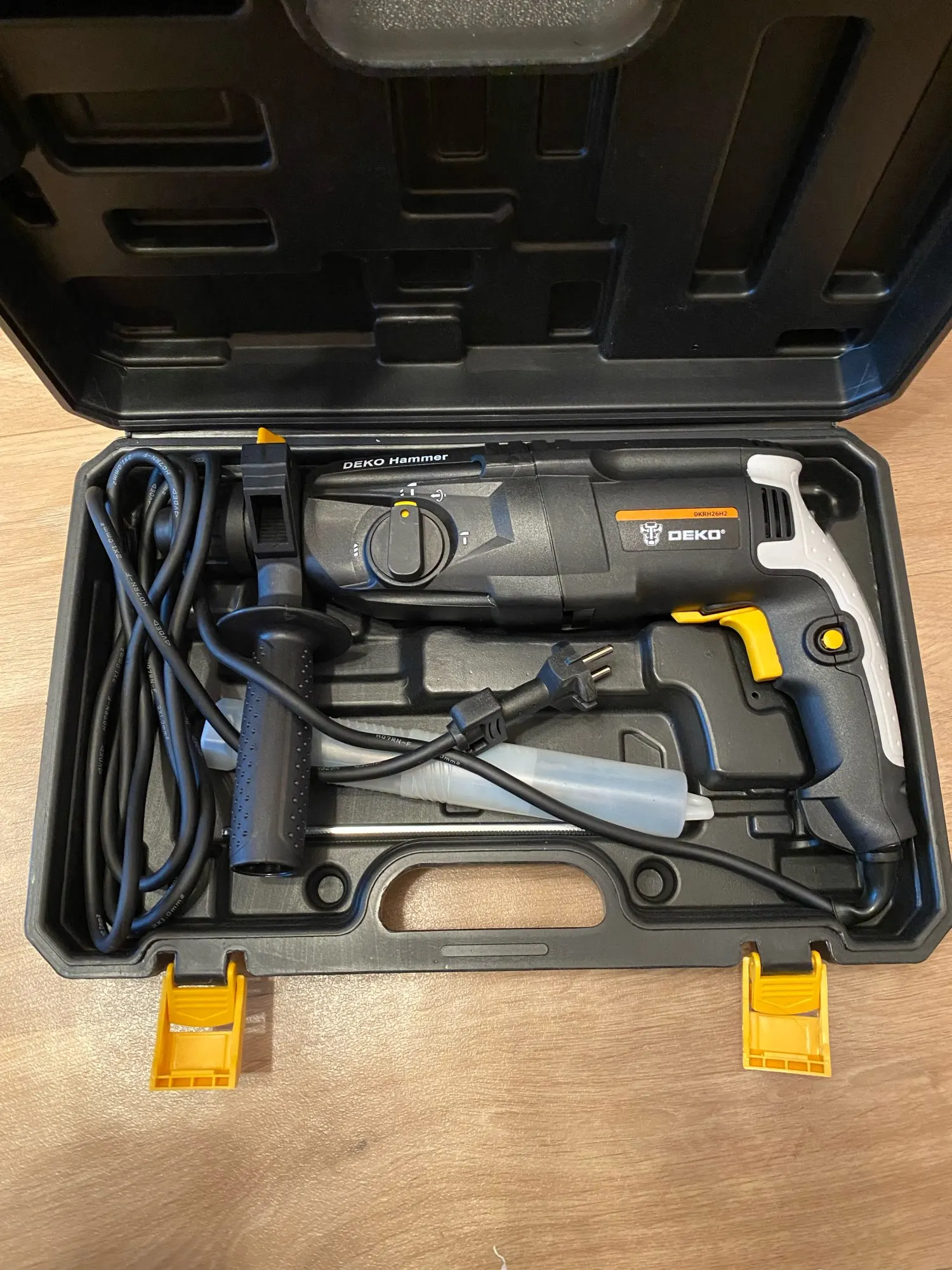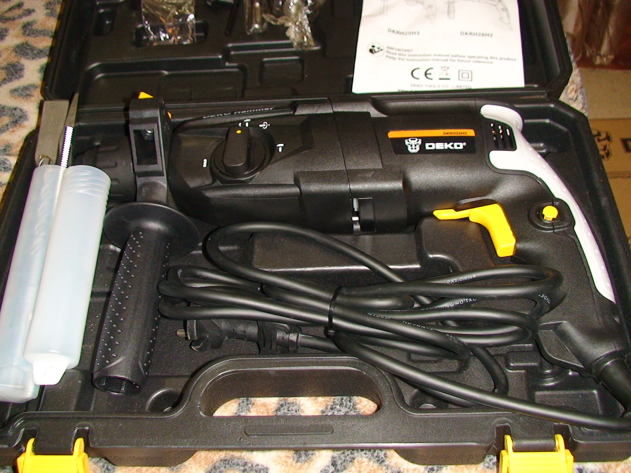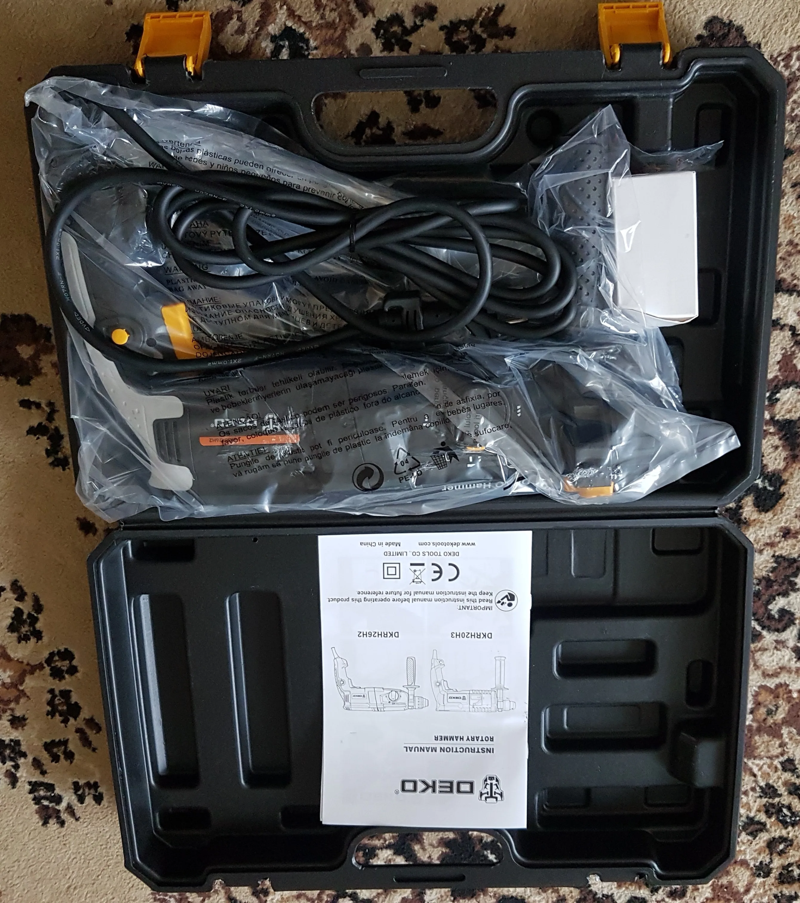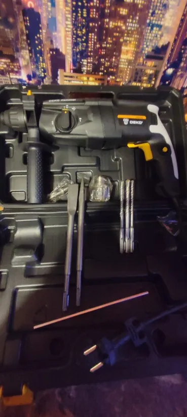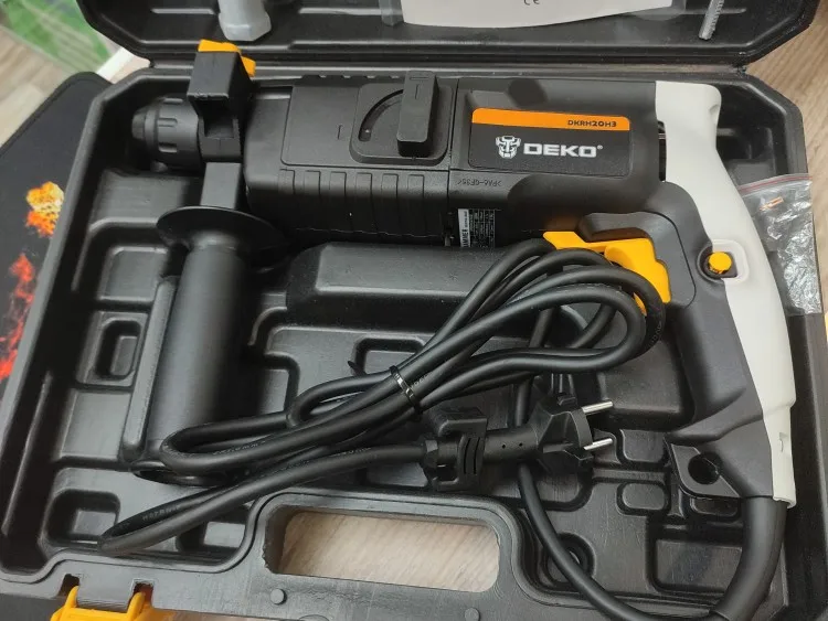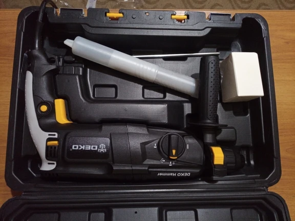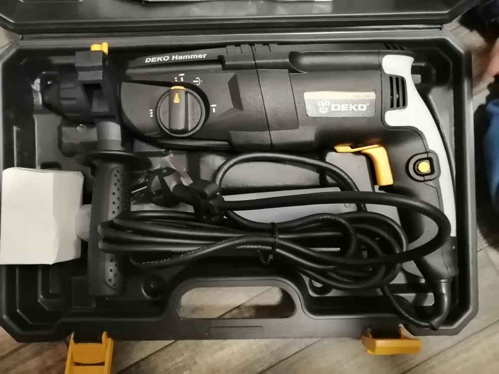 Перф добрался до Волгограда за 13 дней. Все работает, комплектация полная. Единственная претензия к качеству сборки инструмента: щели при стыковках пластмассовых деталей корпуса просто огроменные. Общее впечатление: большой и грубый инструмент. Учитывая цену "черной пятницы" - 37.98$ (в рублях на момент покупки - это менее 2848 р.) киловаттный перфоратор от китайского бренда DEKO можно считать щедрым подарком. Заводской Китай, изготовлен не в шарашке. Неизвестно сколь долго проработает инструмент, надеюсь (почти уверен), что свою цену отобьёт с лихвой, тем более, что приобретался для дома, а не на стройку/производство.