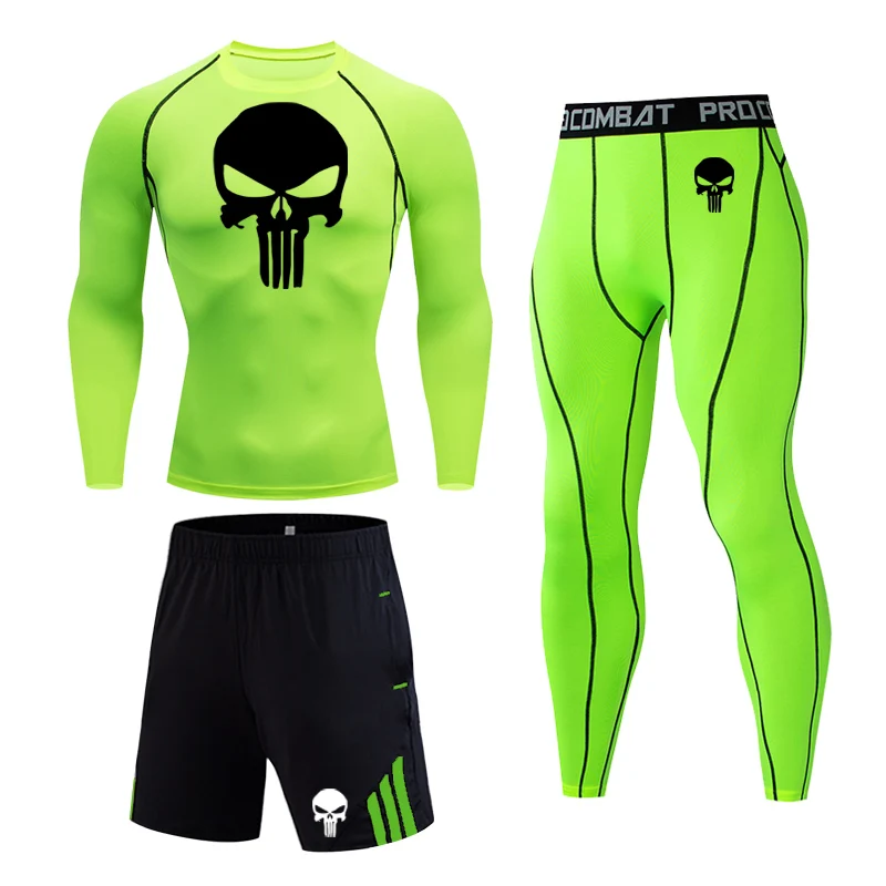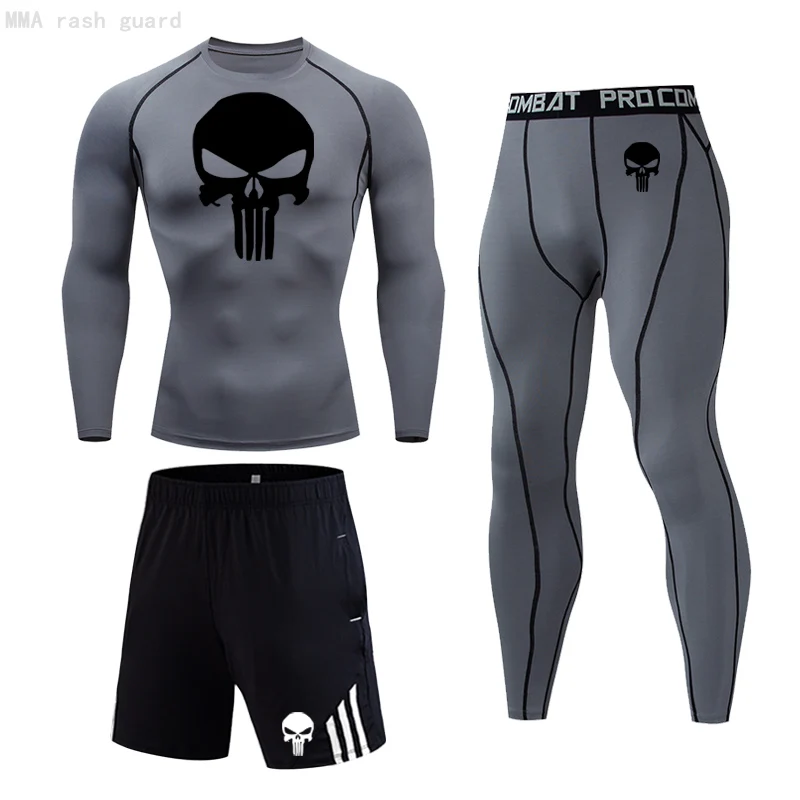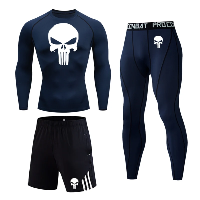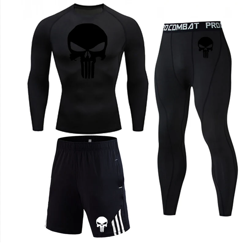 Спортивный костюм для мужчин, черная футболка, Топ с длинным рукавом и черепом, спортивные Леггинсы, спортивная одежда, костюм для бега, компрессионные тренировочные штаны, мужские