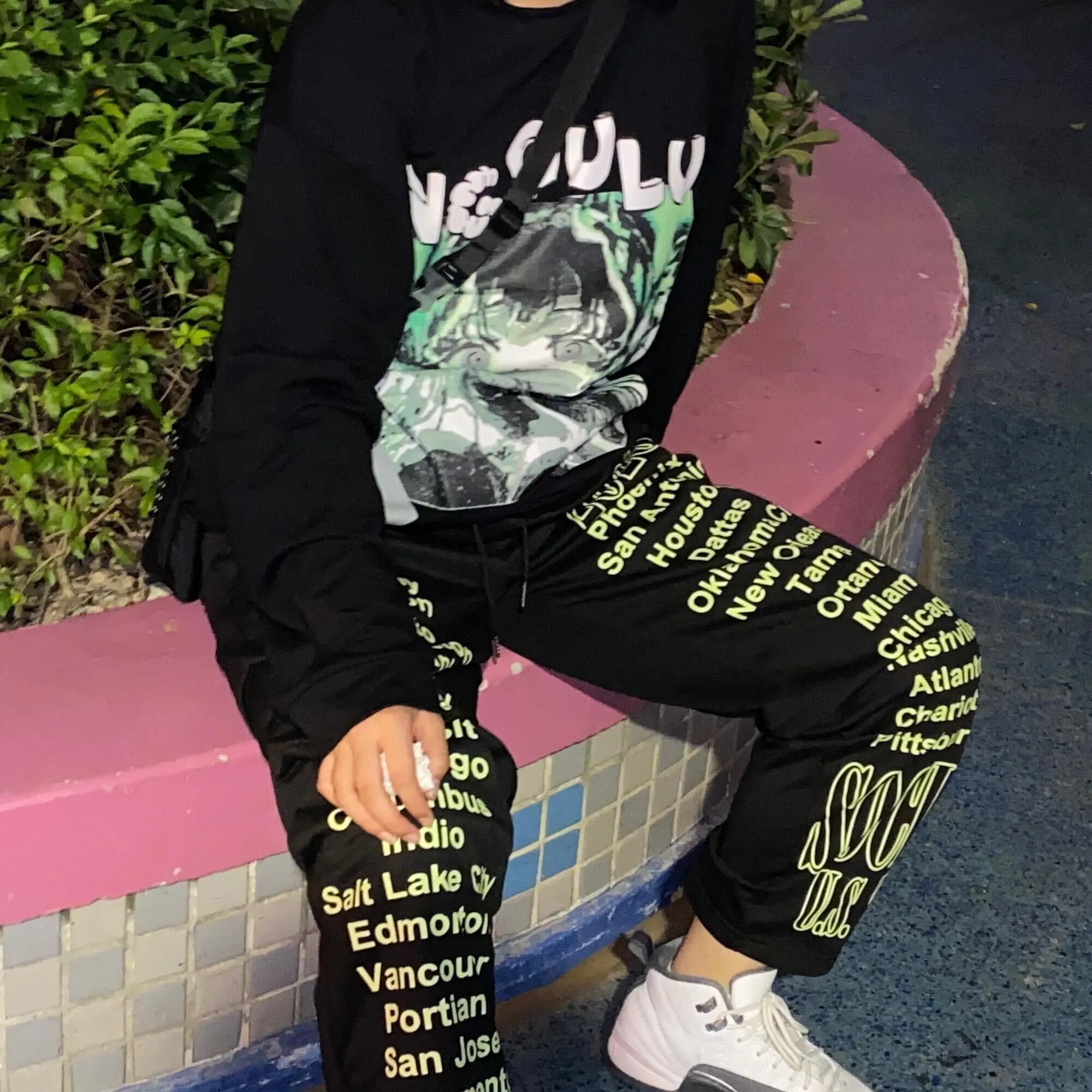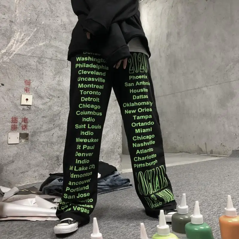 Женские широкие брюки HOUZHOU, Мешковатые Черные уличные брюки с принтом, с высокой талией, в стиле Харадзюку, корейская мода, готический Палаццо