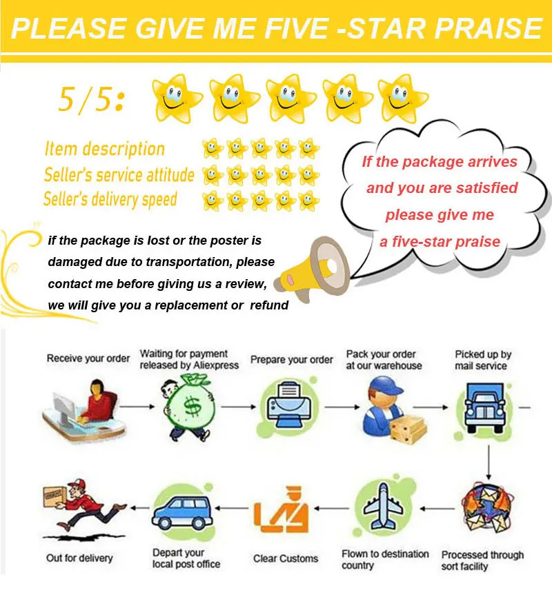 1. Если продукт, который вы получили, поврежден во время транспортировки, пожалуйста, не оставляйте нам плохой отзыв немедленно, вы можете связаться с нами, чтобы решить эту проблему. 2. Если ваше время подтверждения истекает, и вы все еще не получили товар, пожалуйста, свяжитесь с нами, мы продлим дату доставки как можно скорее. 3. Пожалуйста, не открывайте споры в течение 60 дней. Если вы все еще не получили товар через 65 дней, пожалуйста, свяжитесь с нами, чтобы решить эту проблему. Информация о продукте: 1. Материал: 150 г ретро крафт-бумага, без покрытия, не водонепроницаемая 2. Цвет: постеры 100% реальности, но из-за разного отображения изображения реальности цвет difterence, поэтому, скорее всего, получите плакаты, и вы увидите, что фотографии в цвете отличаются. Фактический относительный дисплей плаката будет слегка желтоватым 3. Погрешность в 1-2 см, измеренная вручную, находится в пределах нормального диапазона.