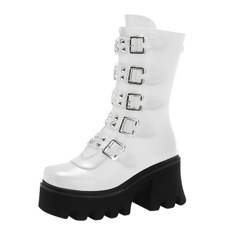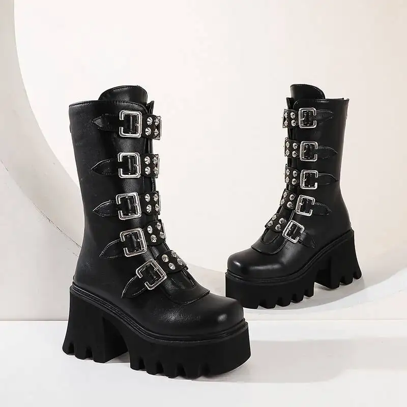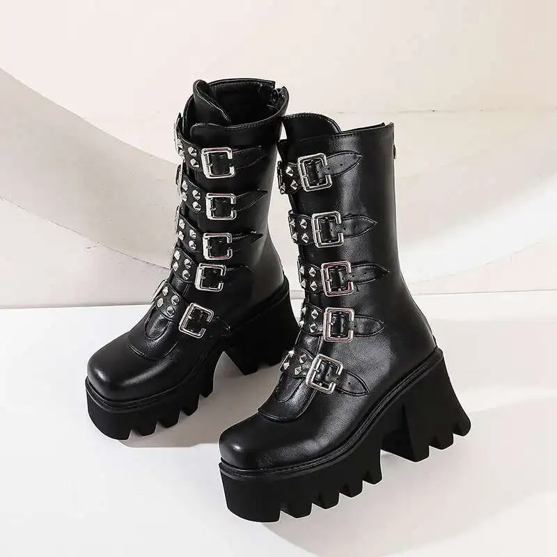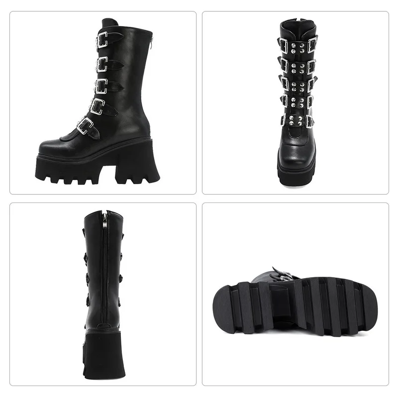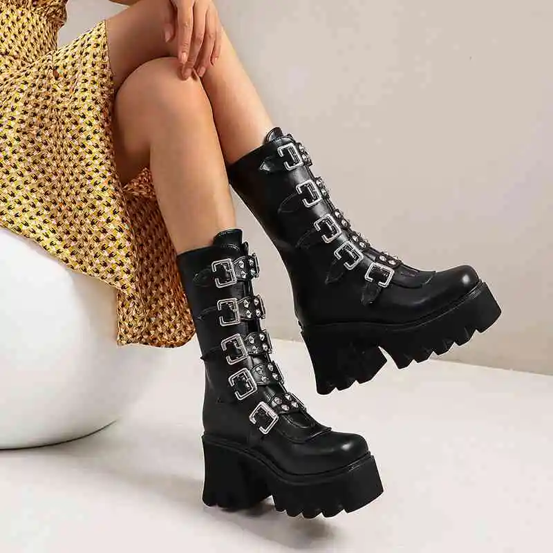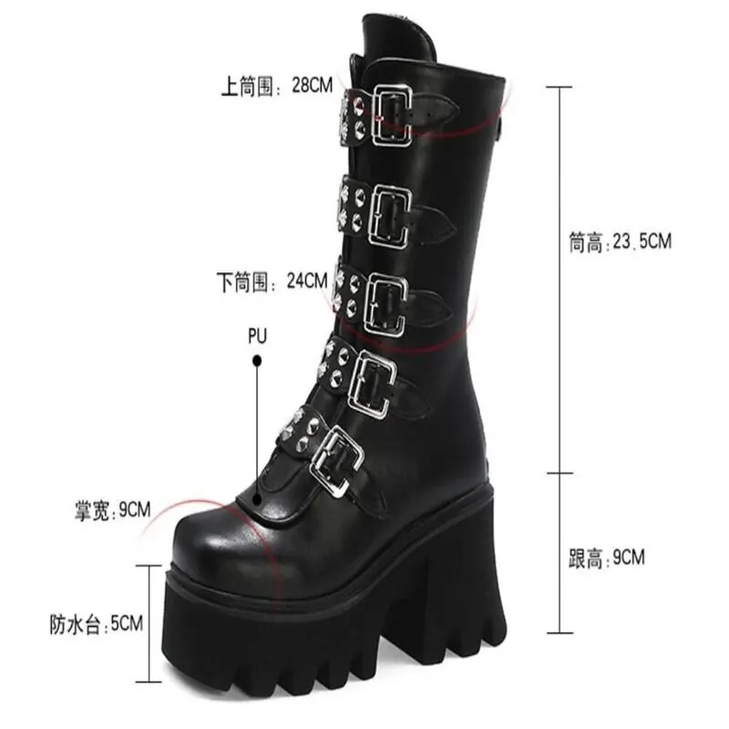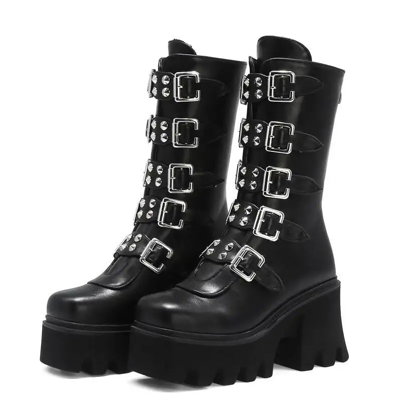 Женские кожаные ботинки до середины икры, на платформе, с пряжкой, в готическом стиле, черные, зимние, Размеры 35-43