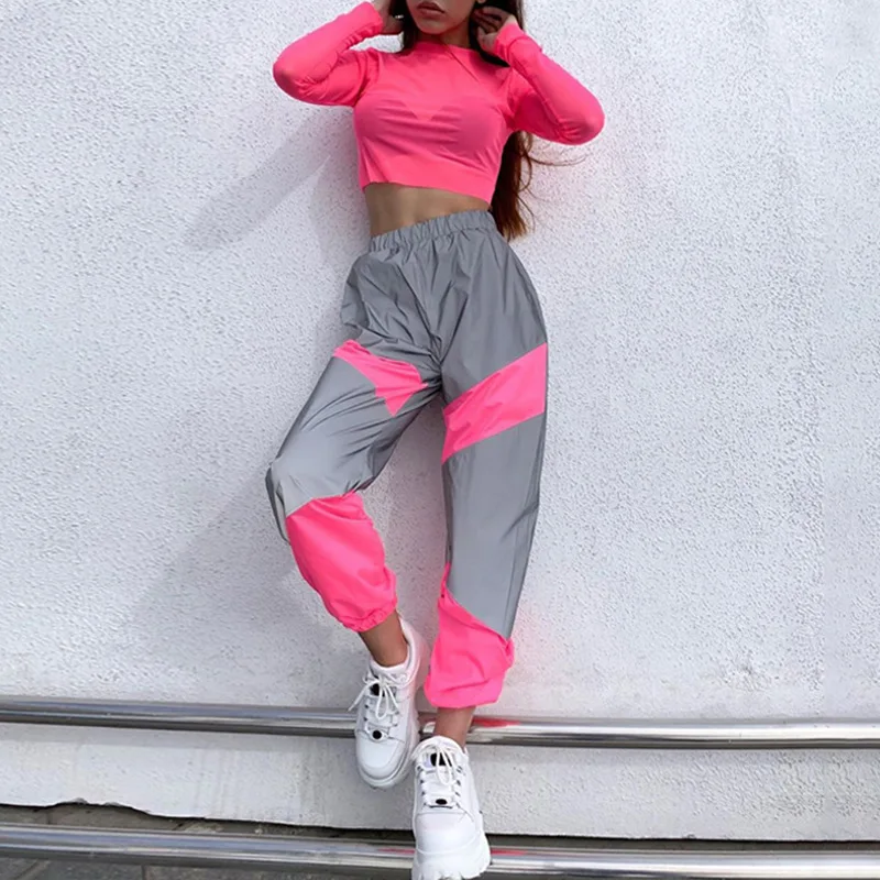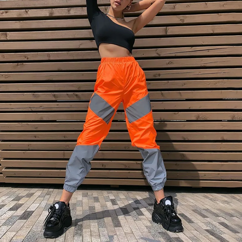 Женская неоновая уличная одежда, брюки-карго, свободные Светоотражающие штаны с завышенной талией в стиле пэчворк, джоггеры, Осень-зима 2021