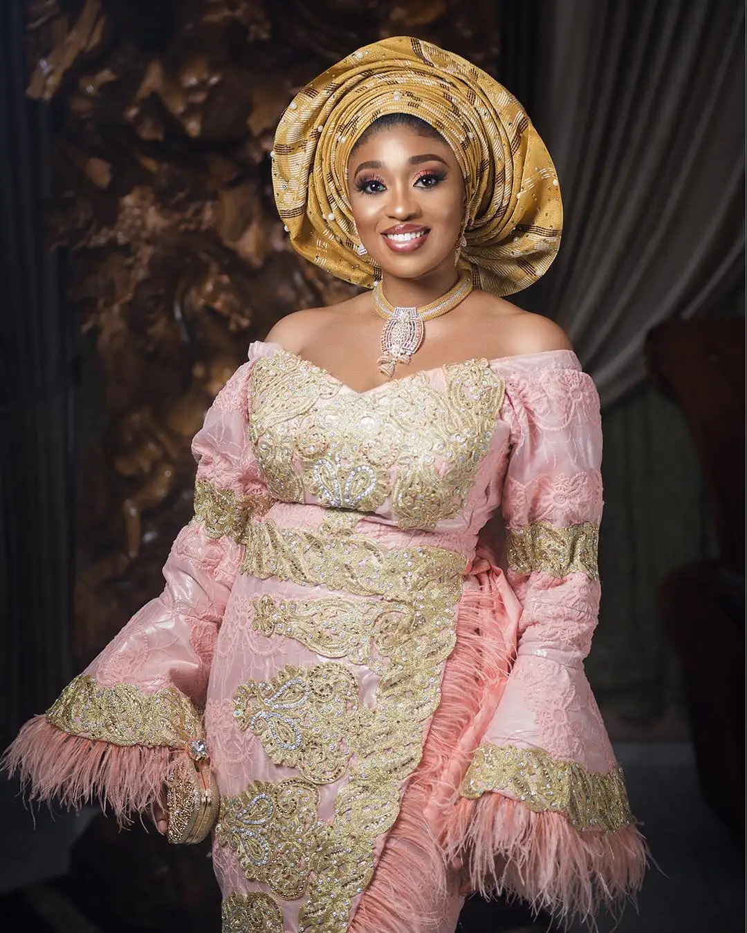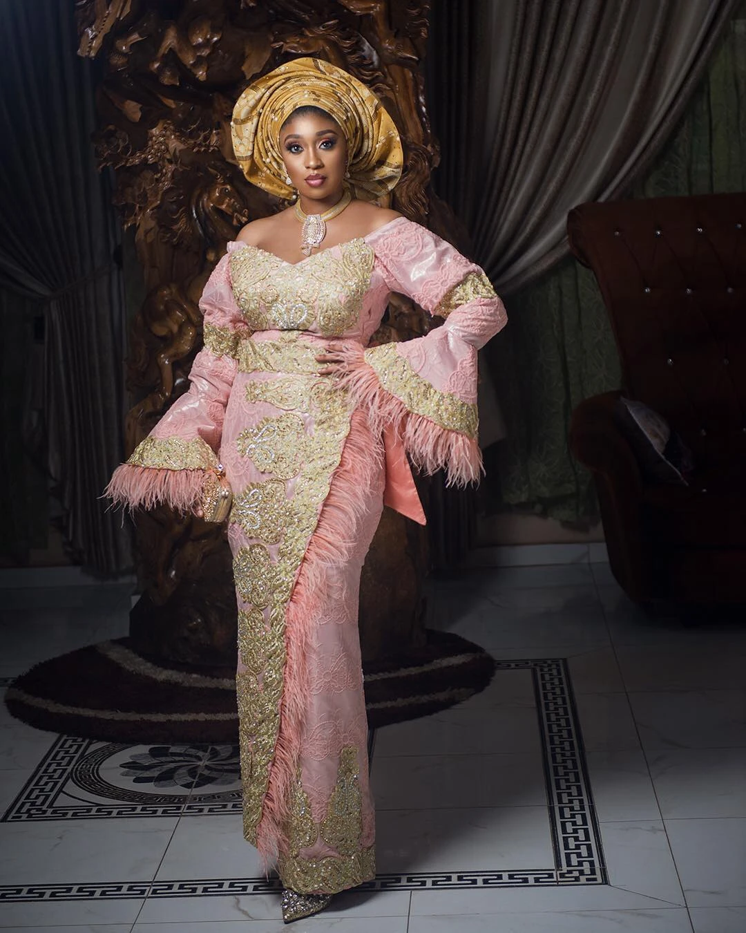 Платье вечернее в пол с перьями, с рукавами-оборками
