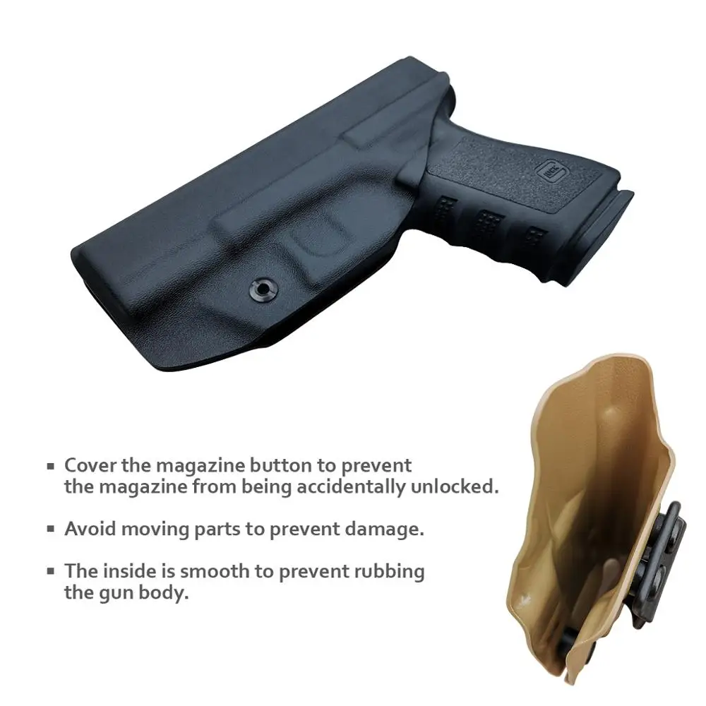 ● Ручная работа US .08 "KYDEX: легкая, прочная, прочная, Влагонепроницаемая и моющаяся, обеспечивает комфорт и уверенность в любой ситуации. Чехол Glock 19 покрывает весь корпус, эффективно предотвращая пот и избегая зажимов, можно безопасно и безопасно использовать.