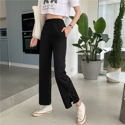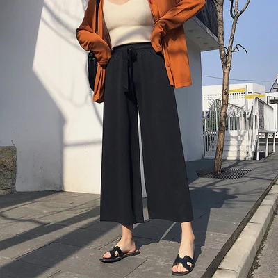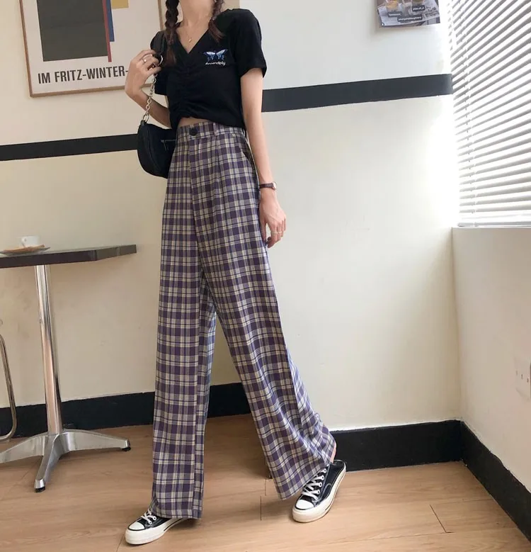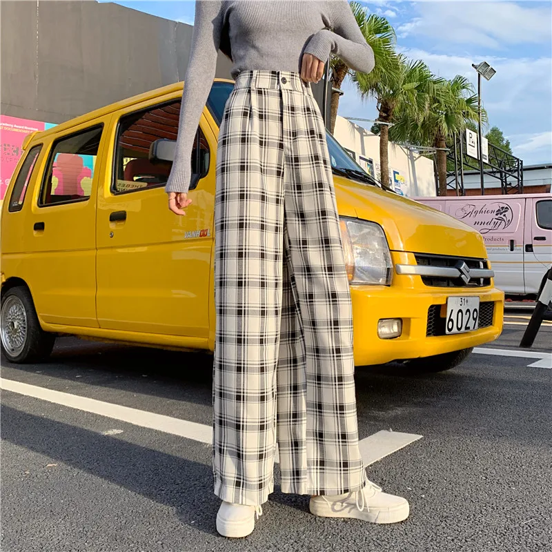 Простые винтажные клетчатые повседневные длинные женские брюки, уличная мода, прямые широкие брюки