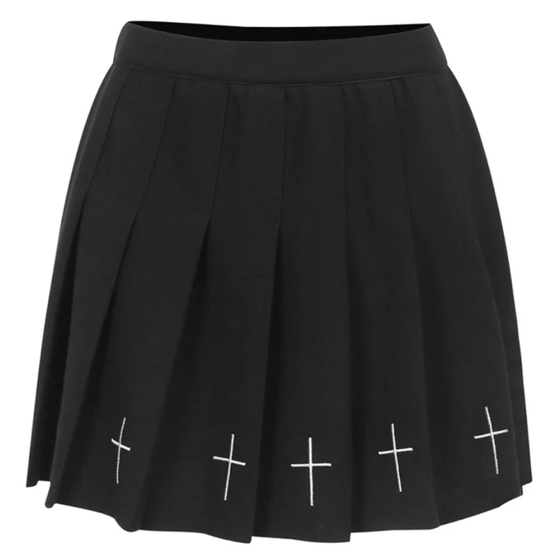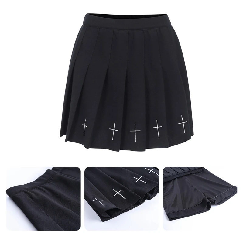 Женская плиссированная короткая юбка-трапеция в стиле панк, с вышивкой крестом, с оборками, с завышенной талией, темно-готика, Харадзюку, уличная одежда