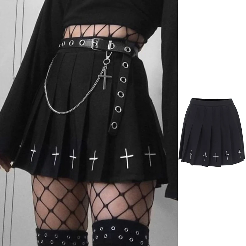 Юбка: высокая талия, застежка-молния, темно-готический стиль панк, вышивка крестом, модная и привлекательная.