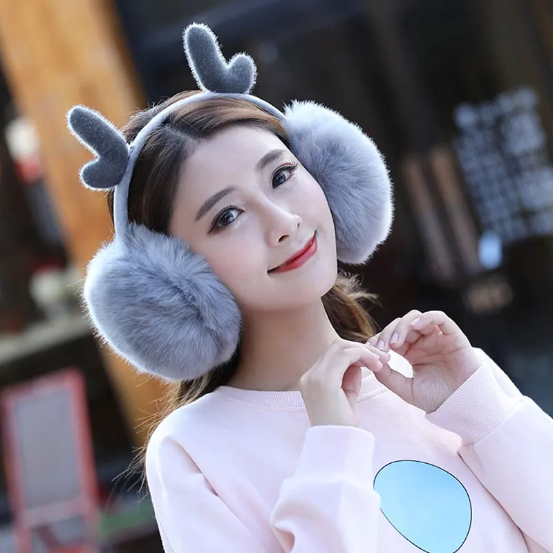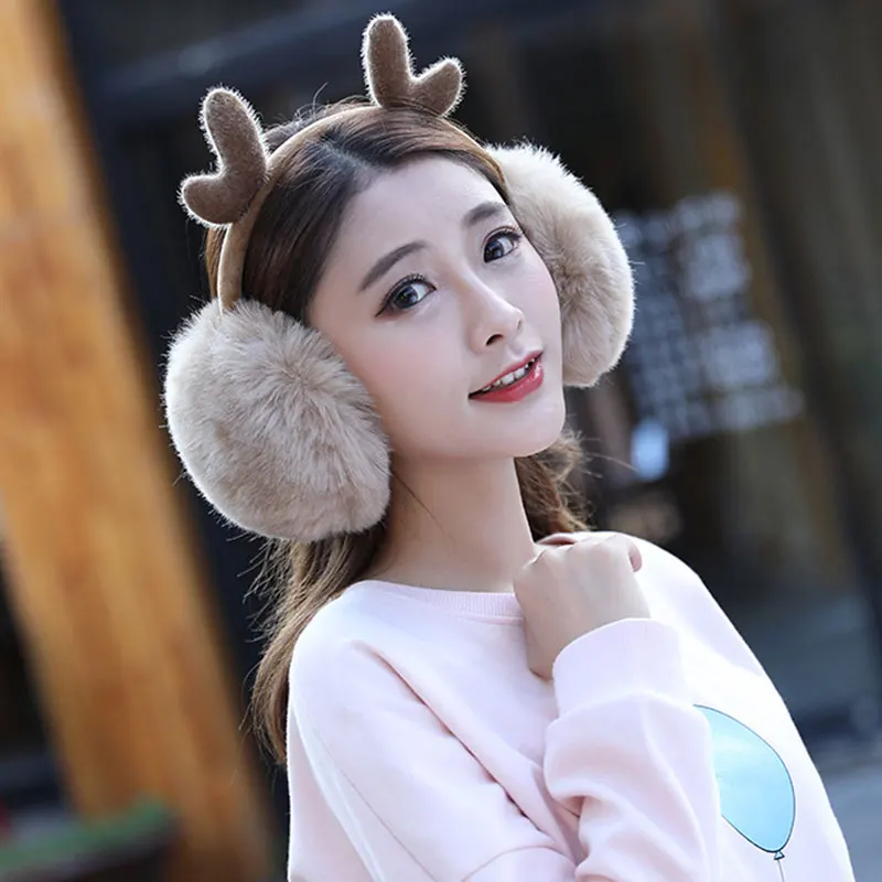 Новогодние наушники с оленьими рогами, новые меховые наушники с оленями, однотонные наушники, женские наушники, зимние теплые удобные наушники с оленями