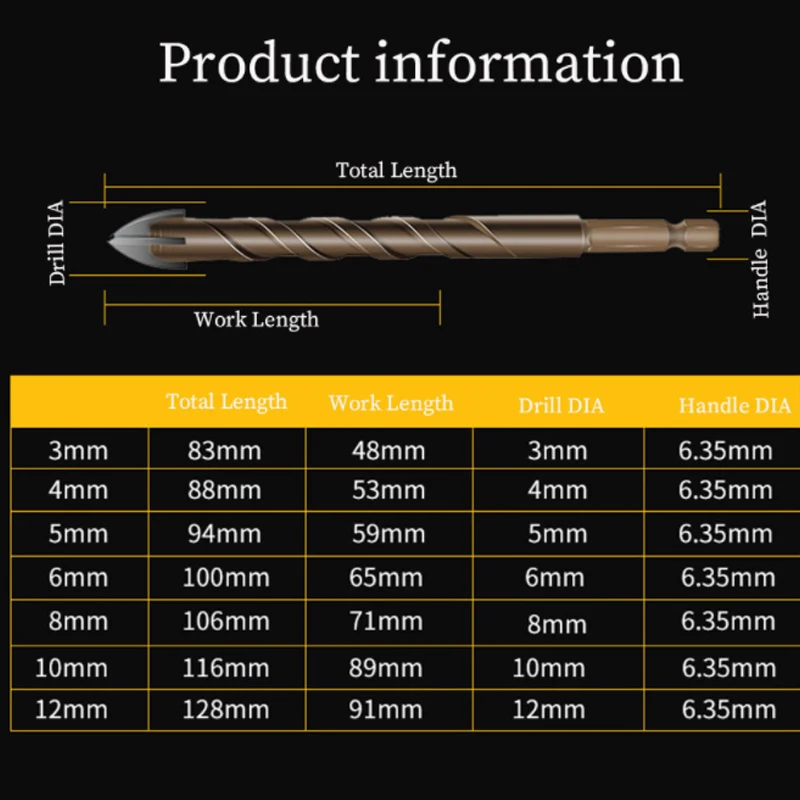 Сверла Oauee шестигранные для стекла, керамики, бетона, открывателя отверстий, кирпича, твердого сплава, треугольные сверла, набор инструментов 1 шт. 3-12 мм