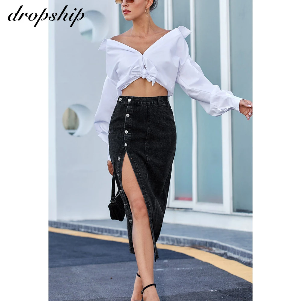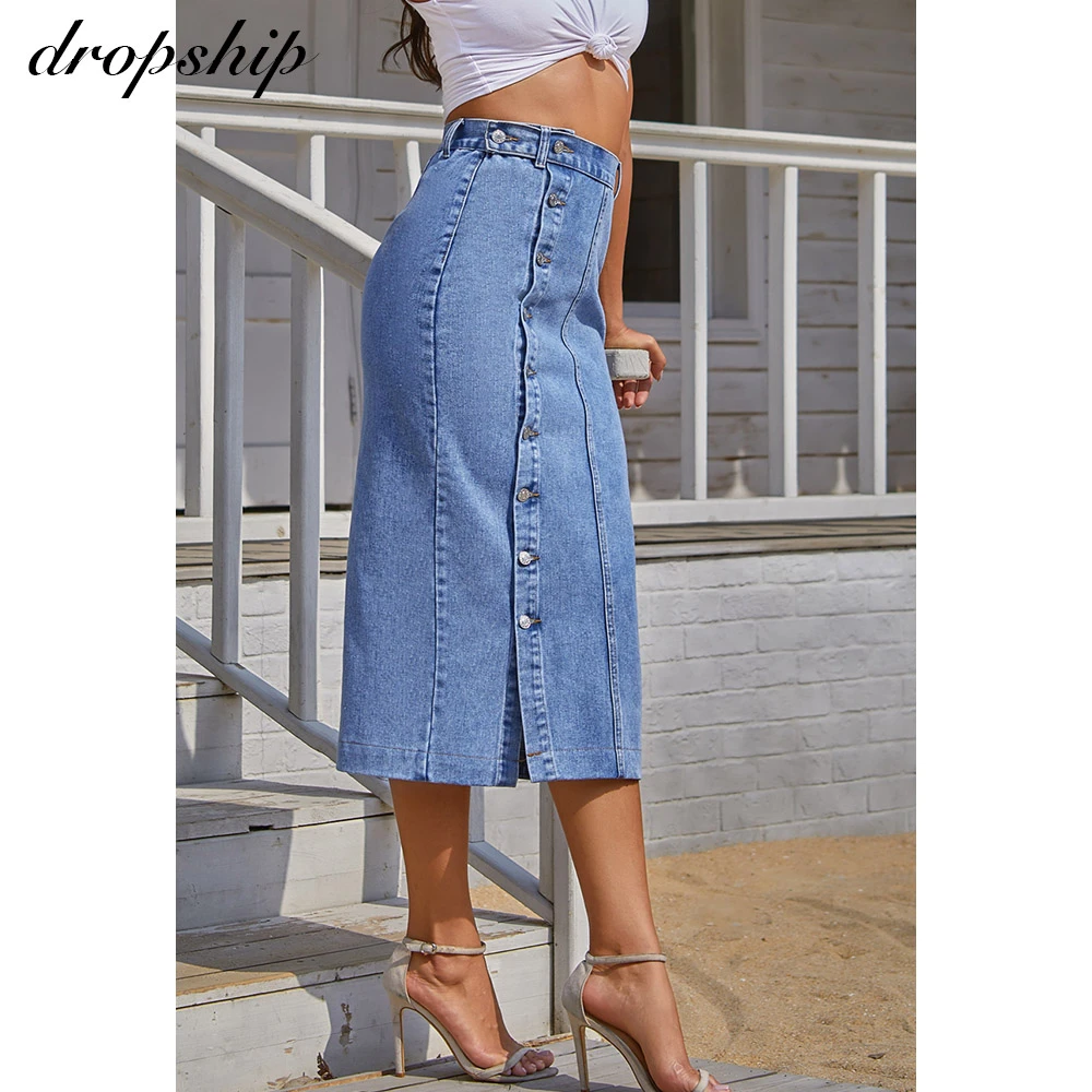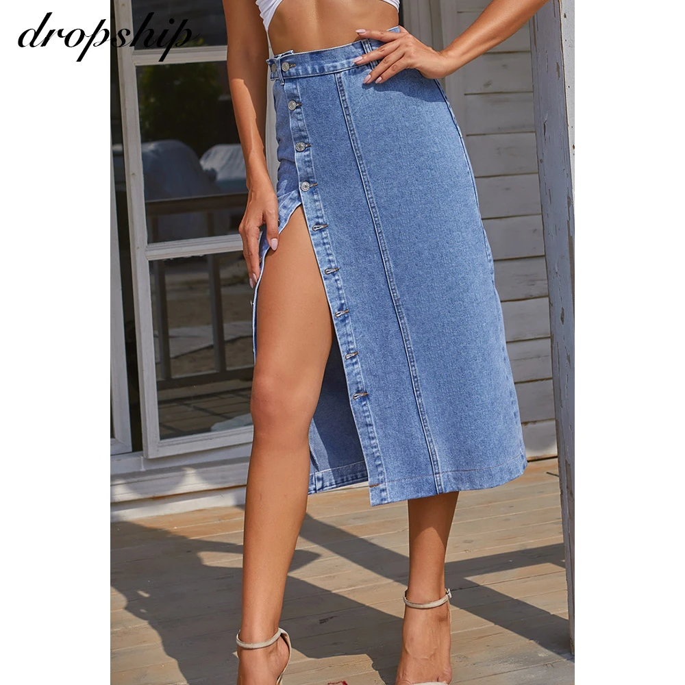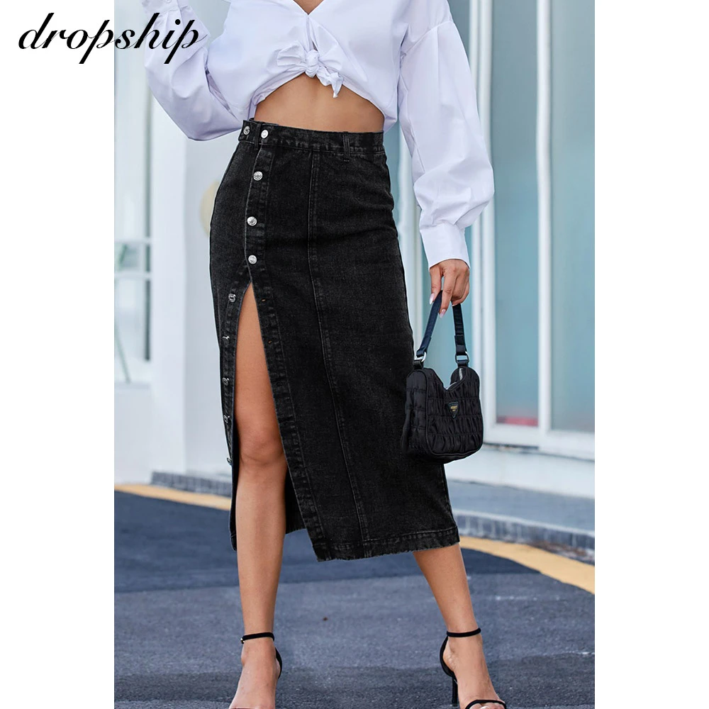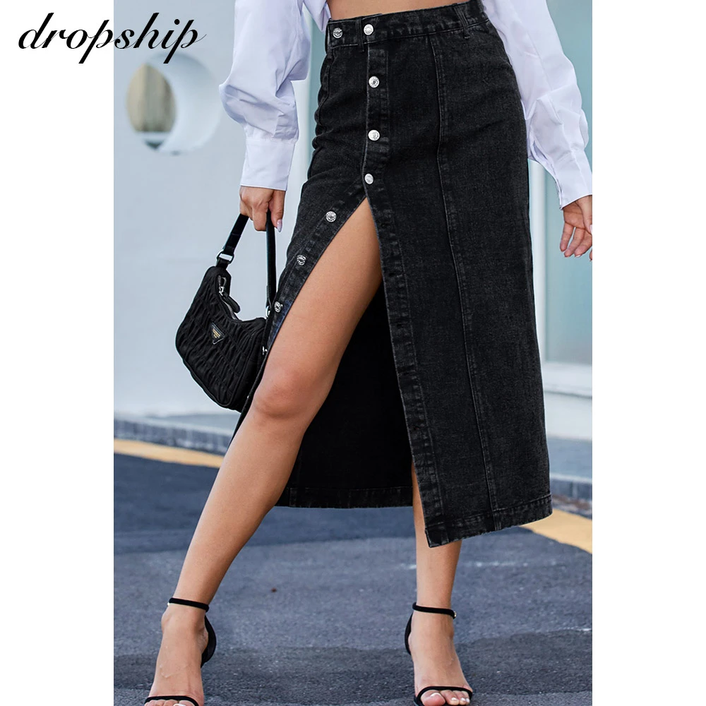 Женская джинсовая юбка средней длины на пуговицах, а-силуэта с Боковым Разрезом и завышенной талией, черно-синяя длинная юбка из денима, Осень-зима 2020