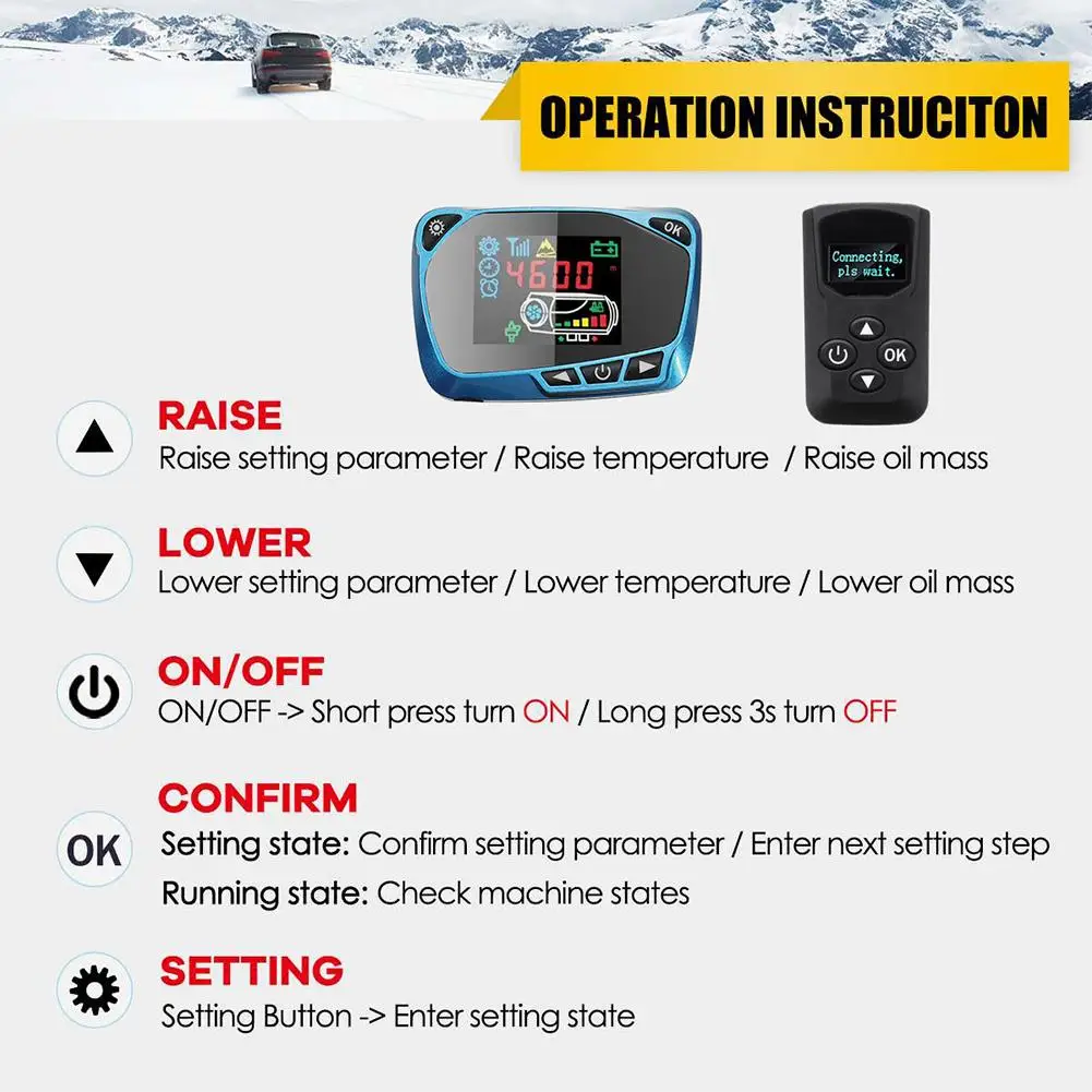 1. Он может обеспечить источник тепла для автомобиля и увеличить температуру внутри автомобиля, чтобы избежать износа двигателя при низких температурах. Способствует размораживанию салона автомобиля, запуску автомобиля и размораживанию автомобильного стекла.2. Низкий уровень выбросов, низкий уровень шума и снижение уровня шума. Пульт дистанционного управления может дистанционно управлять Дизельный подогреватель воздуха для предварительного нагрева и регулировки.3. Низкое топливо и низкое энергопотребление, подходит для долгосрочного использования. ЖК-дисплей может четко отображать рабочее состояние машины и может устанавливать время для включения и выключения, регулировать объем масла, скорость ветра и температуру.4. Компактная конструкция, легко устанавливается, способствует использованию в различных узких пространствах. После замены транспортного средства его можно разобрать на новое транспортное средство.5. Подходит для различных типов дизельных механических транспортных средств, таких как автомобили, грузовики, автобусы, RVs, грузовики, кемперы, караваны, строительные транспортные средства, лодки и т. Д., чтобы насладиться теплом в холодную зиму.Спецификация:Материал: алюминиевый корпус + АБС-пластикЦвет: как на картинкеРазмеры: около 39*15*18 см/15,35*5,91 * 7.09inНапряжение: 12 В/24 В (опционально)Мощность: 5000 ВтТопливо: ДизельРасход топлива (л/ч): 0,18-0.64лРабочая температура нагревателя: -40 ℃-50 ℃Рабочая температура масляного насоса: -40 ℃-40 ℃Упаковочный лист:1 x Воздушный обогреватель1 x ЖК-дисплей1 x фильтр1 х глушитель1 х 10 л топливный бак1 пульт дистанционного управления1 x ремешок1 х впускная труба1 х выхлопная труба1 х выходной канал1 х масляная труба1 х масляный насос1 x насадка1 х шнур питания1 x фиксированная плата1 комплект установкиПримечание:Для автомобиля с аккумулятором, пожалуйста, выберите напряжение 12 В. Для автомобиля с 2 батареями, пожалуйста, выберите напряжение 24 В (как правило, грузовики или грузовики). Пожалуйста, подтвердите напряжение батареи и выберите для покупки.