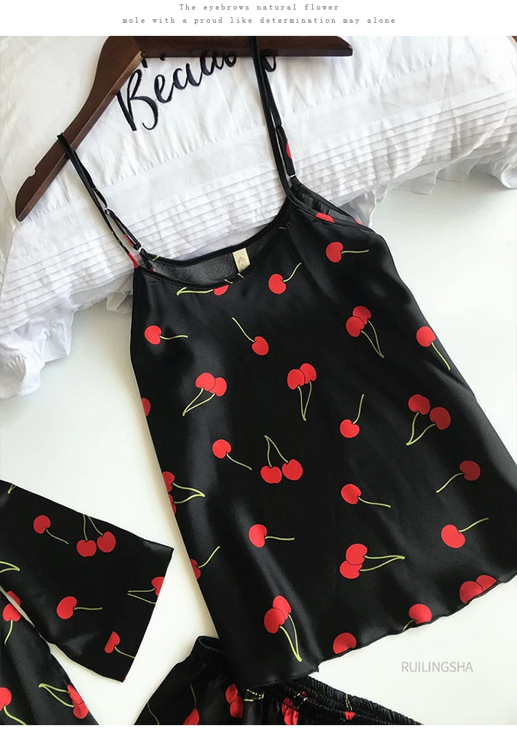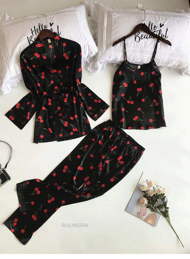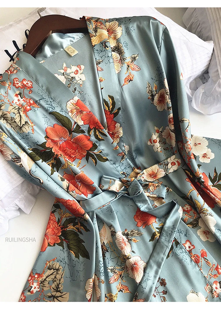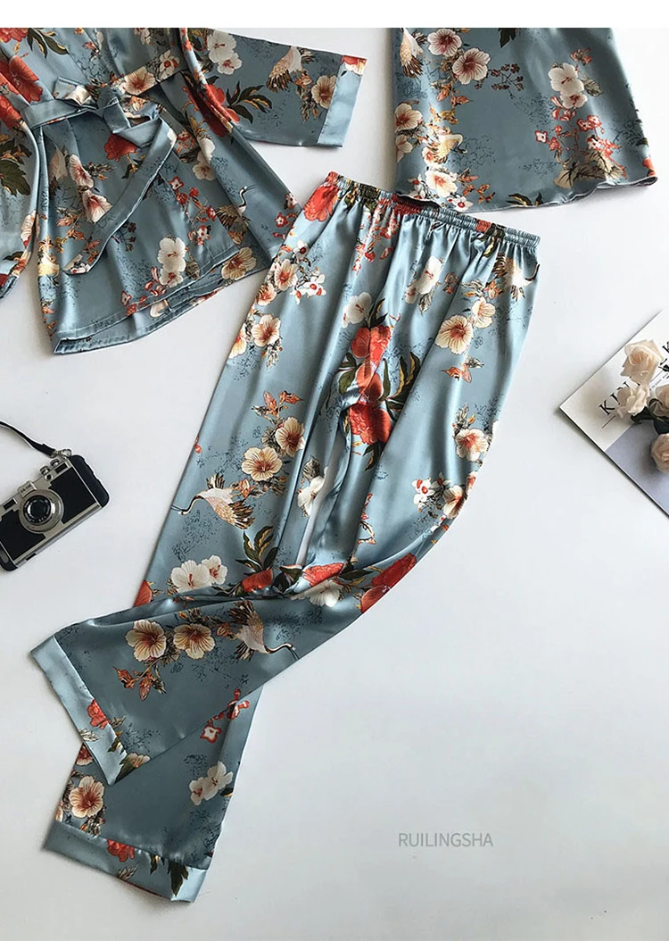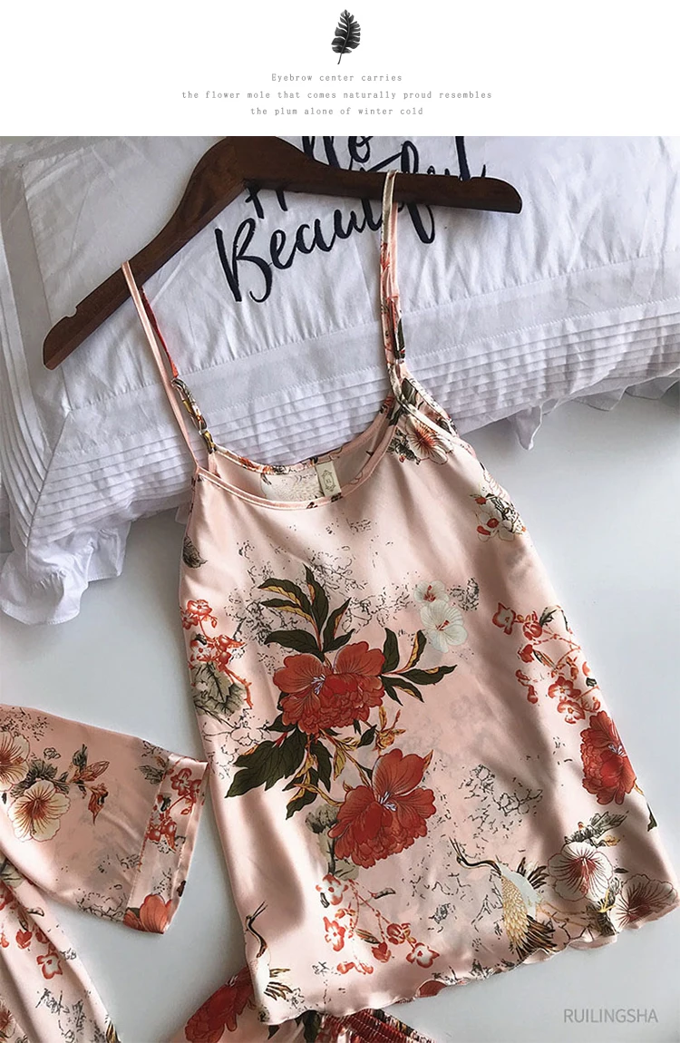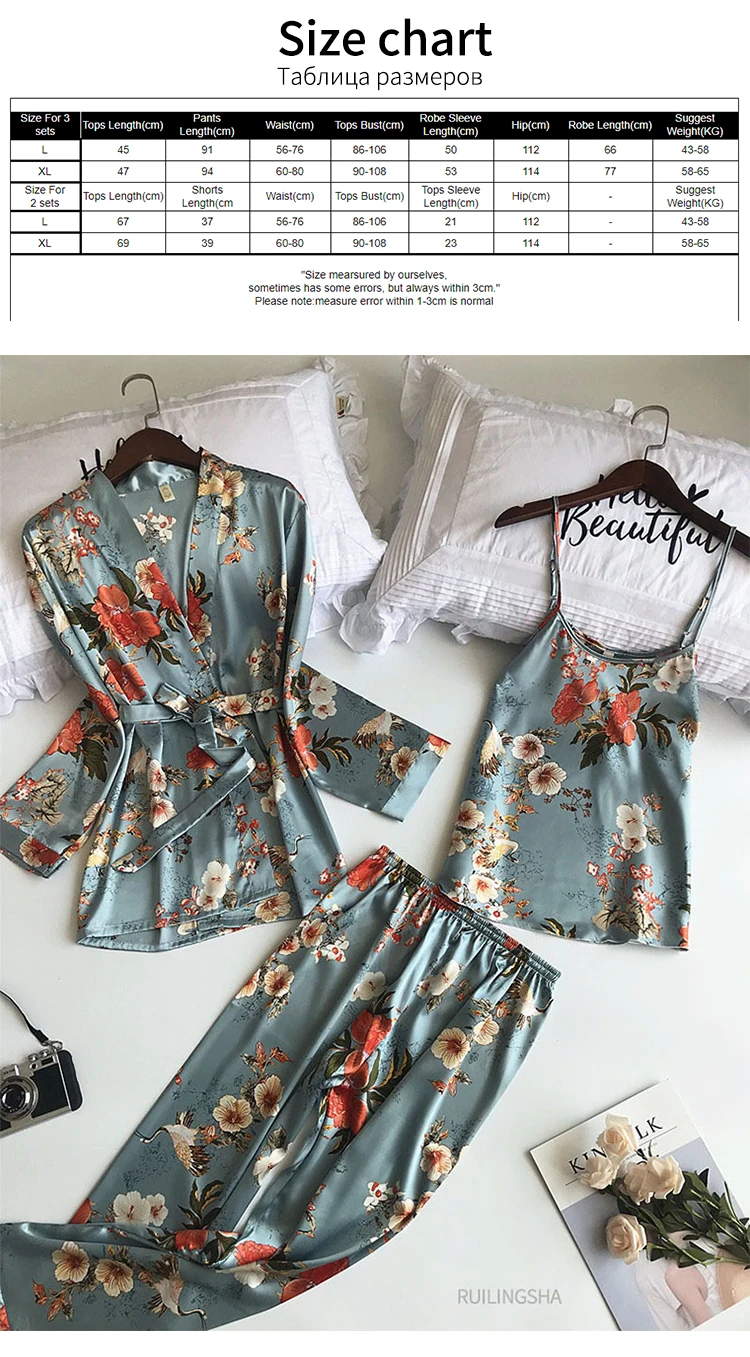Женская летняя обувь из 3 х предметов наборы для ухода за кожей из искусственного шелка с цветочным принтом кимоно Пижама размера плюс сексуальные ночные рубашки для девочек Женская одежда для сна, комплекты