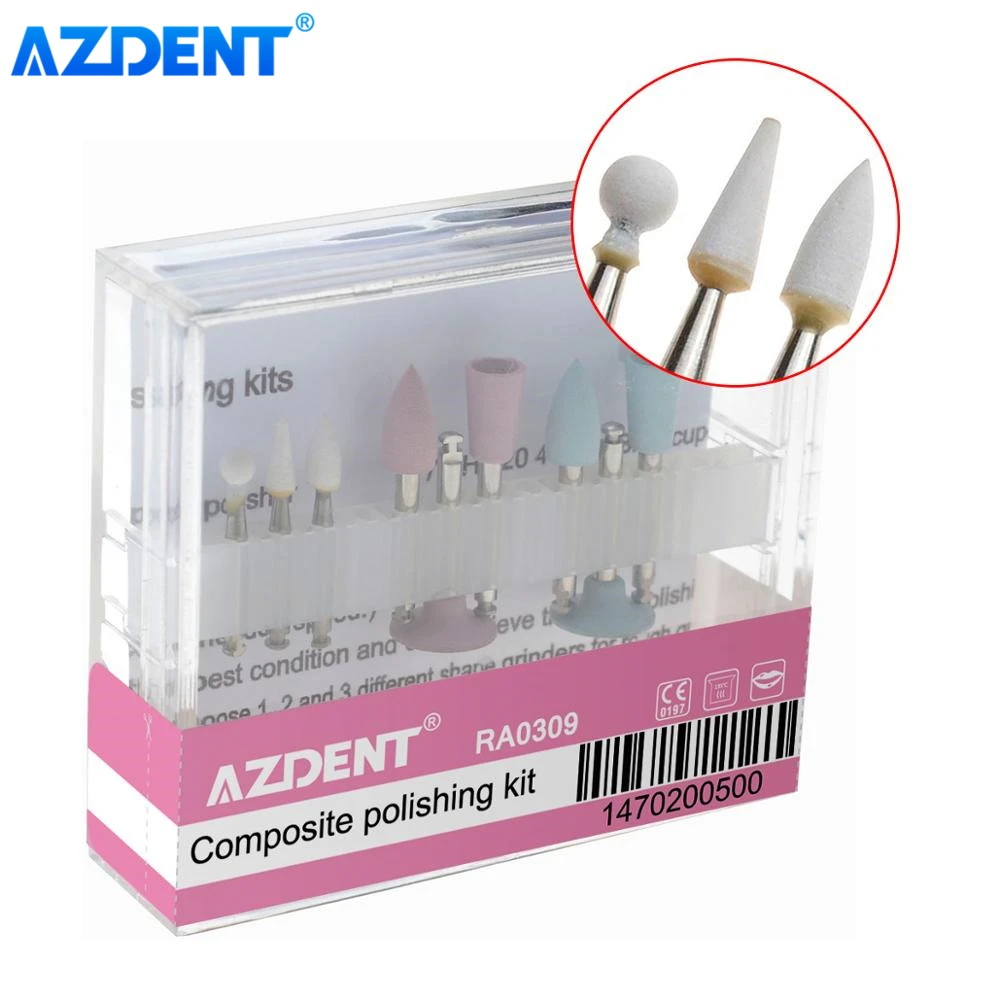Набор для полировки стоматологических композитных материалов AZDENT 9 шт.коркор., RA 0309 для низкоскоростного наконечника, против угла, керамические силиконовые резиновые полировальные машинки
