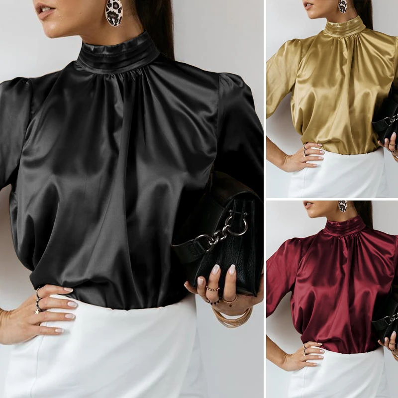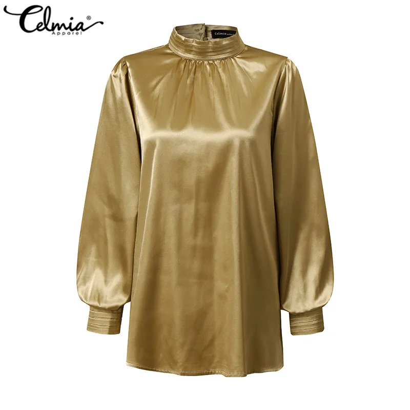 Celmia Женская модная атласная блузка 2021 Элегантная туника Серебристые Топы Осенняя Однотонная рубашка с высоким воротником вечерние блузки с длинным рукавом Женские