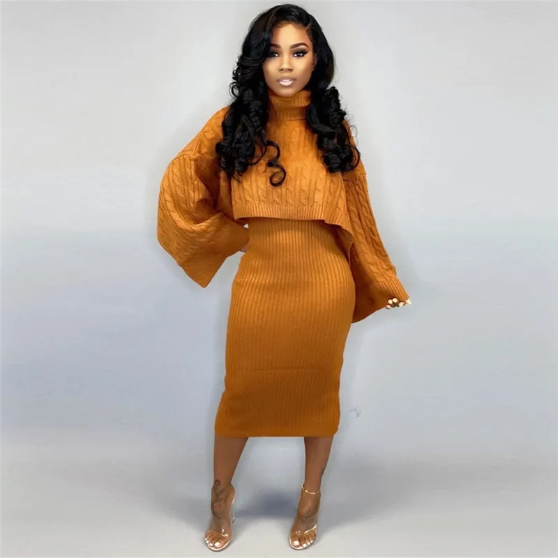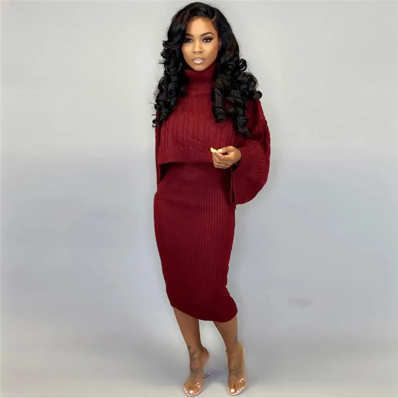 Осенне-зимний женский комплект из 2 предметов, новинка, лидер продаж, платье средней длины, свитер с высоким воротником, комплект, Бесплатная доставка, оптовая продажа, Прямая поставка
