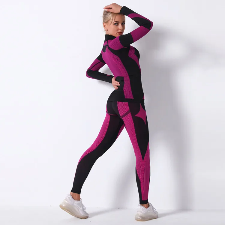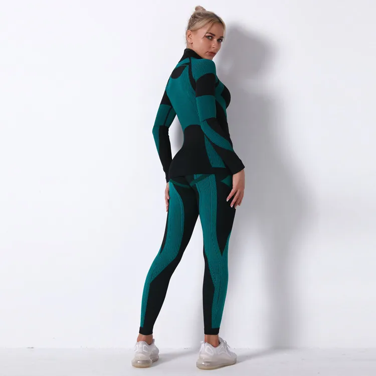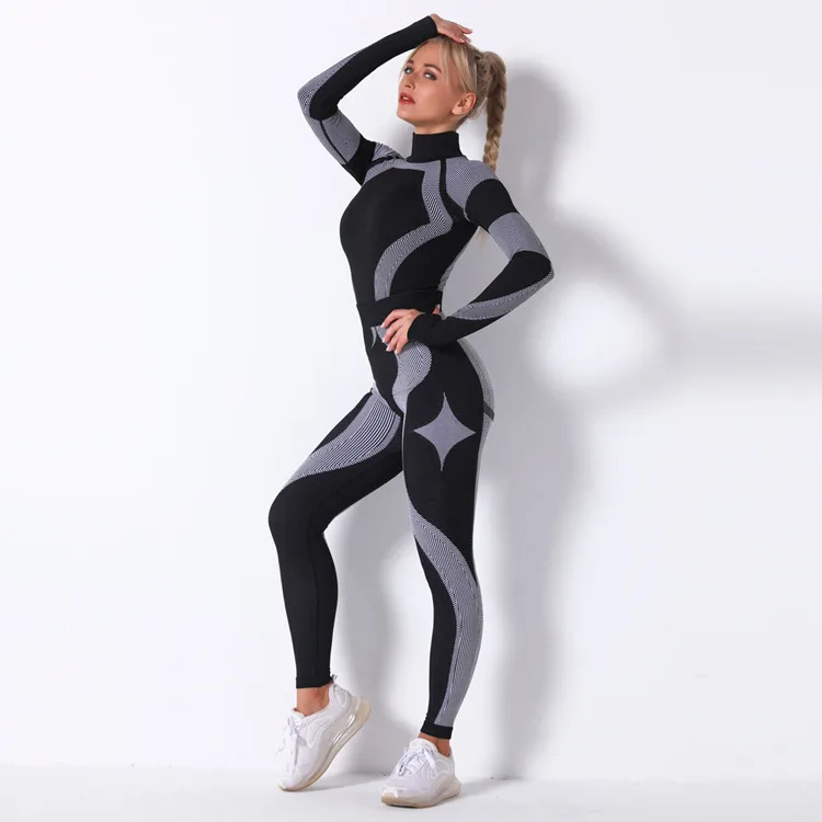 Yushuhua трикотажная полосатая бесшовная спортивная одежда с высоким воротником рубашка с длинным рукавом Леггинсы для фитнеса Женский комплект для йоги спортивный комплект из 2 предметов