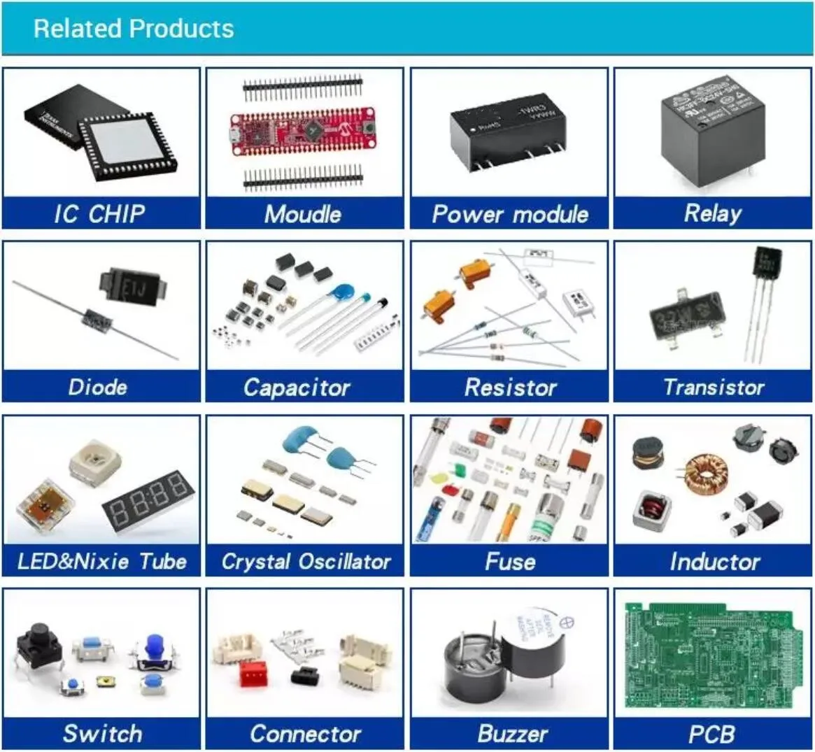 О: мы являемся производителем электронных компонентов и дистрибьютором для более чем 60 ведущих в отрасли поставщиков по всему миру. Наша продукция-ИС, Транзисторы, диоды, конденсаторы, резисторы, индукторы, разъемы, модули IGBT, кабели FFC, потенциометры, переключатели, Кварцевые генераторы, предохранители, зуммеры, трубки Nixie и реле, И т. Д. Все, что можно придумать об электронных компонентах!