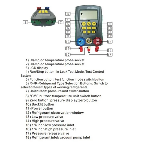 Прибор может измерять двойное давление (манометрическое давление) одновременно, а также двойное измерение температуры (требуется тестовый зажим, не входит в комплект), с автоматическим мульти-единичным преобразованием давления, автоматическое преобразование температуры Цельсия/Фаренгейта, чтобы облегчить различные потребности. Встроенный 89 видов хладагента давления-испарения температуры базы данных, также рассчитать перегрев охлаждения, чтобы облегчить прямое считывание данных рабочих процессов. Также он проверяет процент измерения вакуума; Измерение утечки давления, запись Скорости времени утечки. Заслуживает того, чтобы этот многофункциональный, точный и просто управляемый цифровой коллектор позволял вам делать работу правильно.