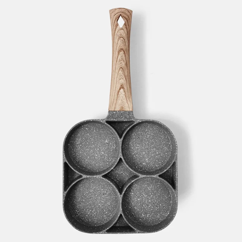 Сковорода с четырьмя отверстиями, утолщенная сковорода для омлета, для приготовления бургеров, яиц, ветчин, оладьев, деревянная ручка, антипригарная, для приготовления завтрака