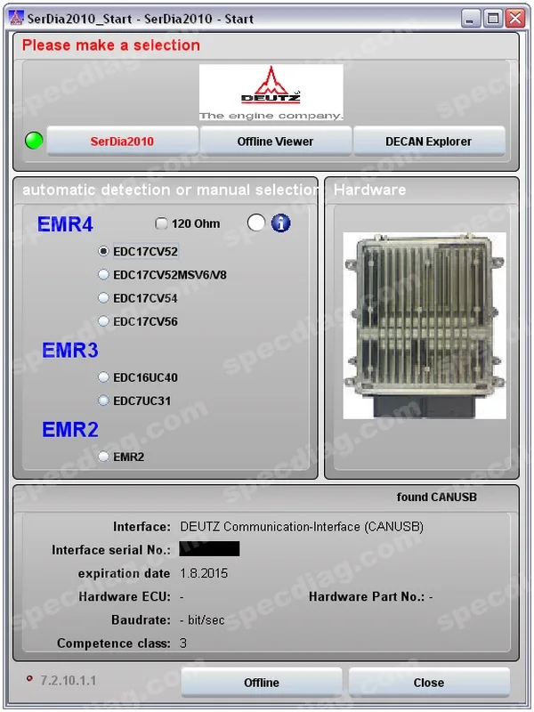 SerDia 2010-Диагностический и программный инструмент, используемый для контроллеров Deutz. Поддерживаемые контроллеры: EMR2; EMR3 (EDC16UC40, EDC7UC31); EMR4 (EDC17CV52, EDC17CV52MSV6/V8, EDC17CV54, EDC17CV56). Поддерживаемые языки: английский, немецкий, французский, испанский, итальянский.