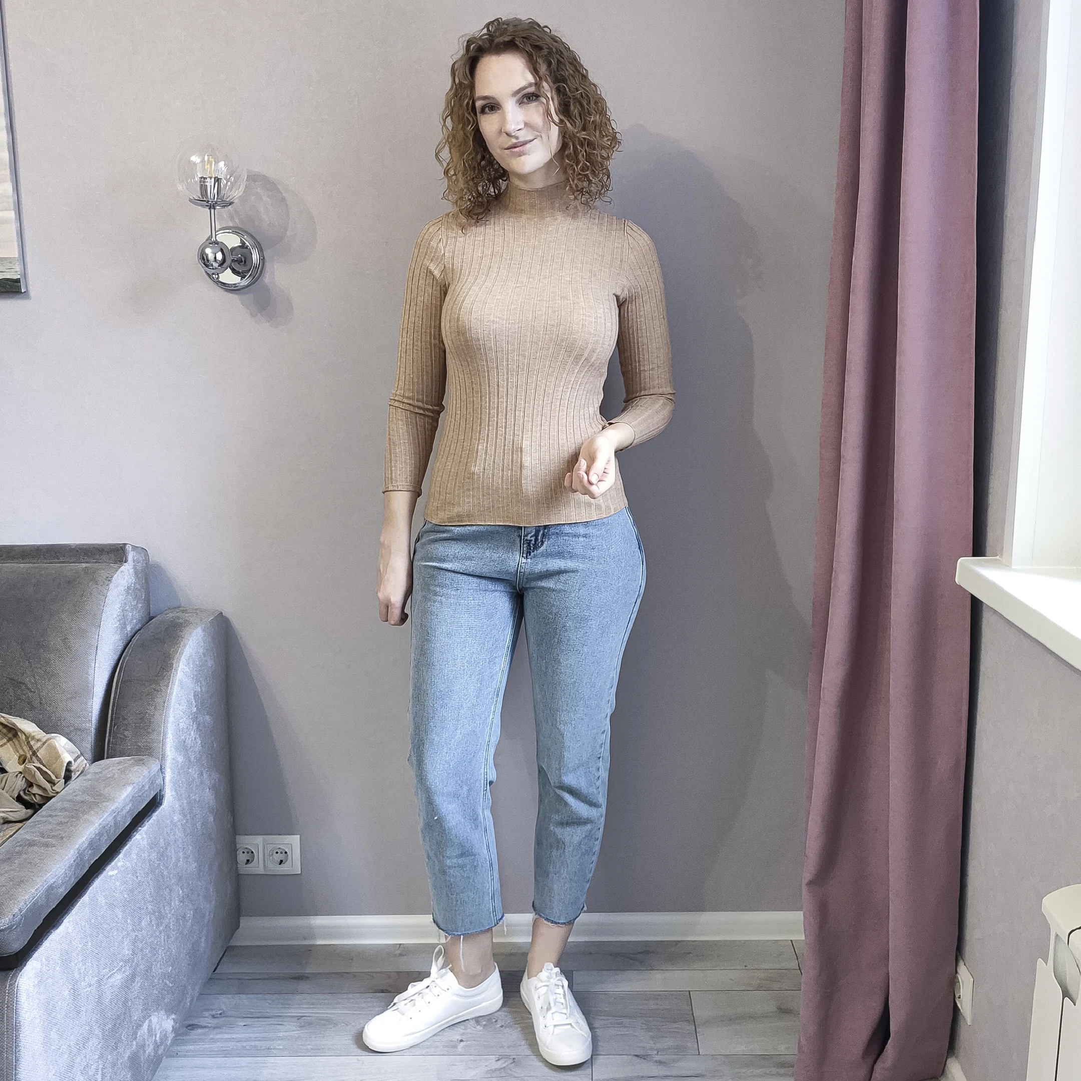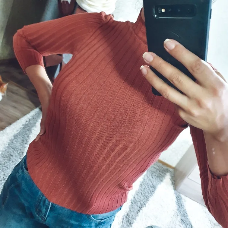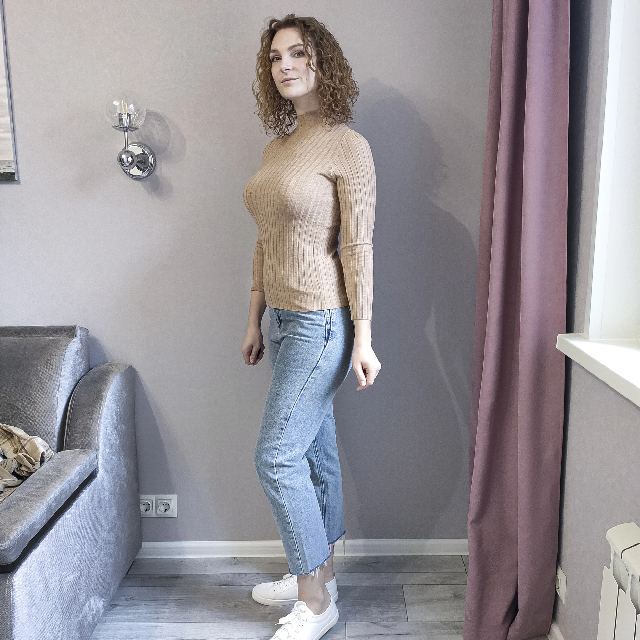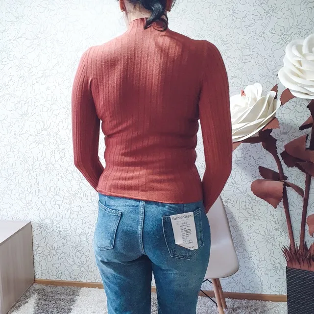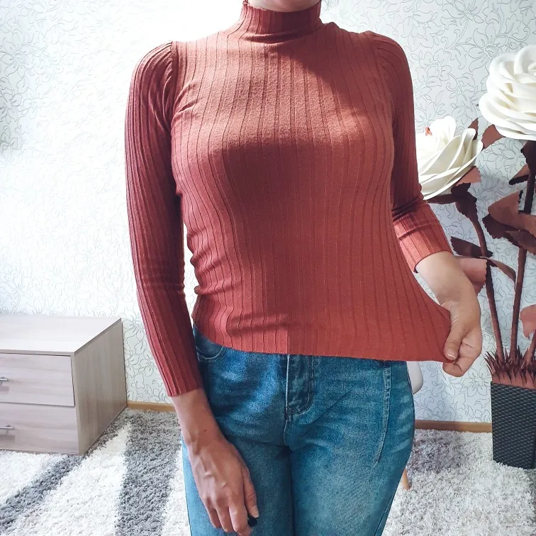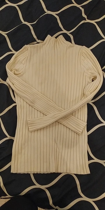Свитерок мягкий и приятный к телу, но тонковат. В бежевом цвете белье просвечивает. Думаю, в более темных цветах нет этой проблемы. Ранее брала подобный гольфик в мелкий рубчик, тот больше понравился. Отправлял продавец долго, но доехала посылка очень быстро - за 10 дней в Украину.