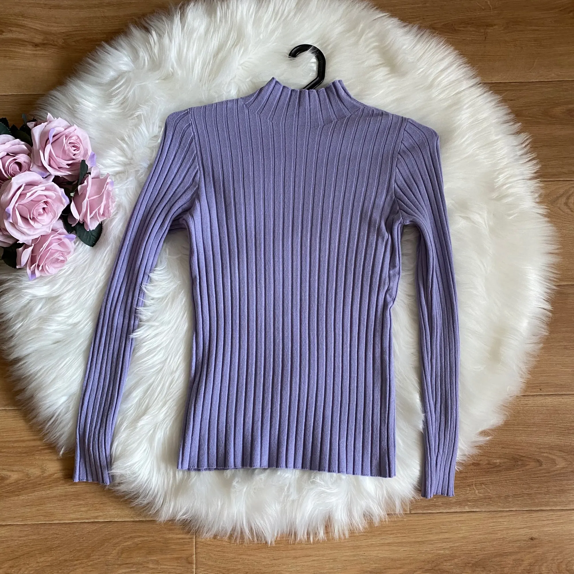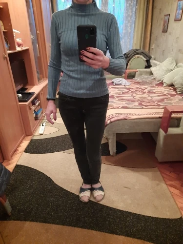 Водолазка пришла за месяц. Очень приятный нежный сиреневый цвет. Водолазка тонкая, но не просвечивает. Меня очень порадовали рукава. Это просто катастрофа всегда с рукавами на китайских водолазках, а в этой модели прекрасная длина. Да и сама водолазка тоже умеренно длинная, хотя бы можно заправить в юбку или джинсы. К телу очень приятный материал, брака в пошиве я не заметила. На мой 42-44 прекрасно села.