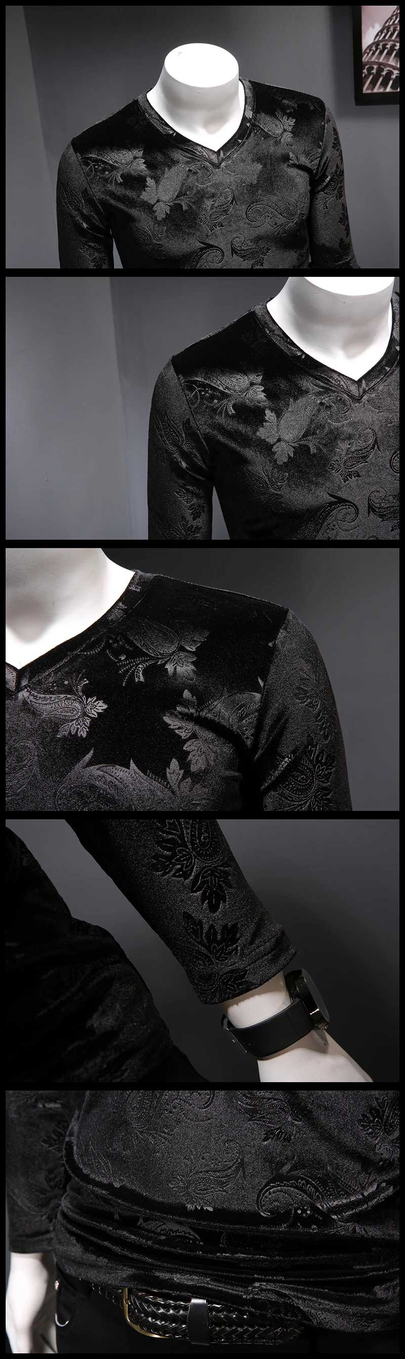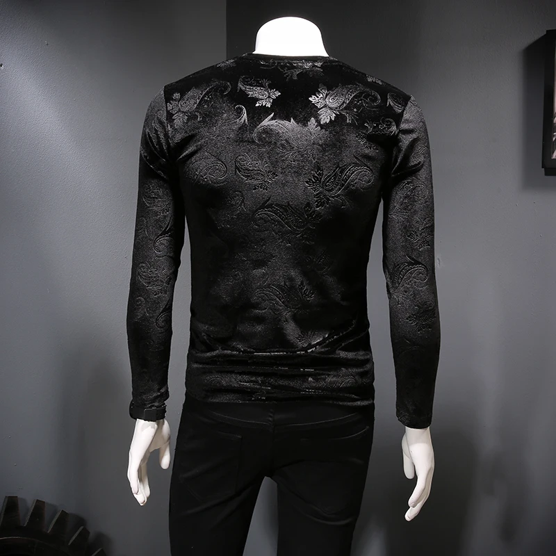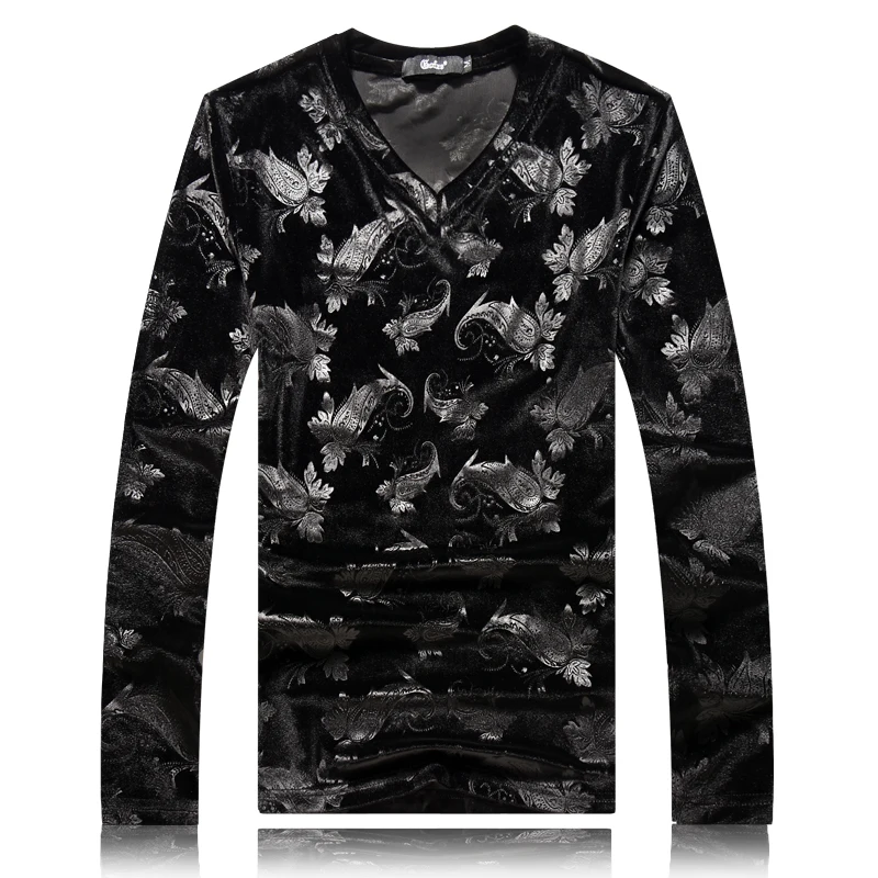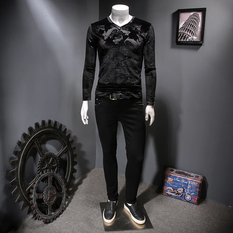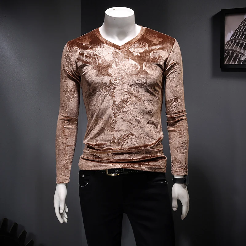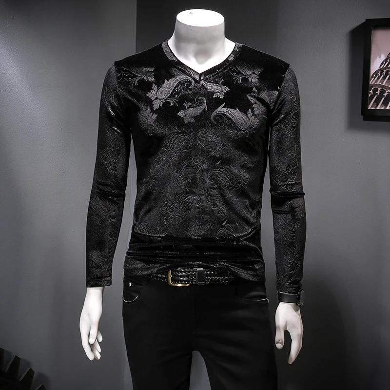 Футболка мужская с V-образным вырезом, Повседневная Уличная одежда в британском стиле, винтажная бархатная Клубная одежда в стиле хип-хоп, с длинным рукавом