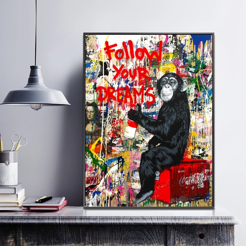 Бэнкси арт надписью Follow Your Dreams обезьяна холст Плакаты фон с изображением уличного граффити настенные художественные плакаты и принты Плакаты и принты Животные картинки для домашнего декора