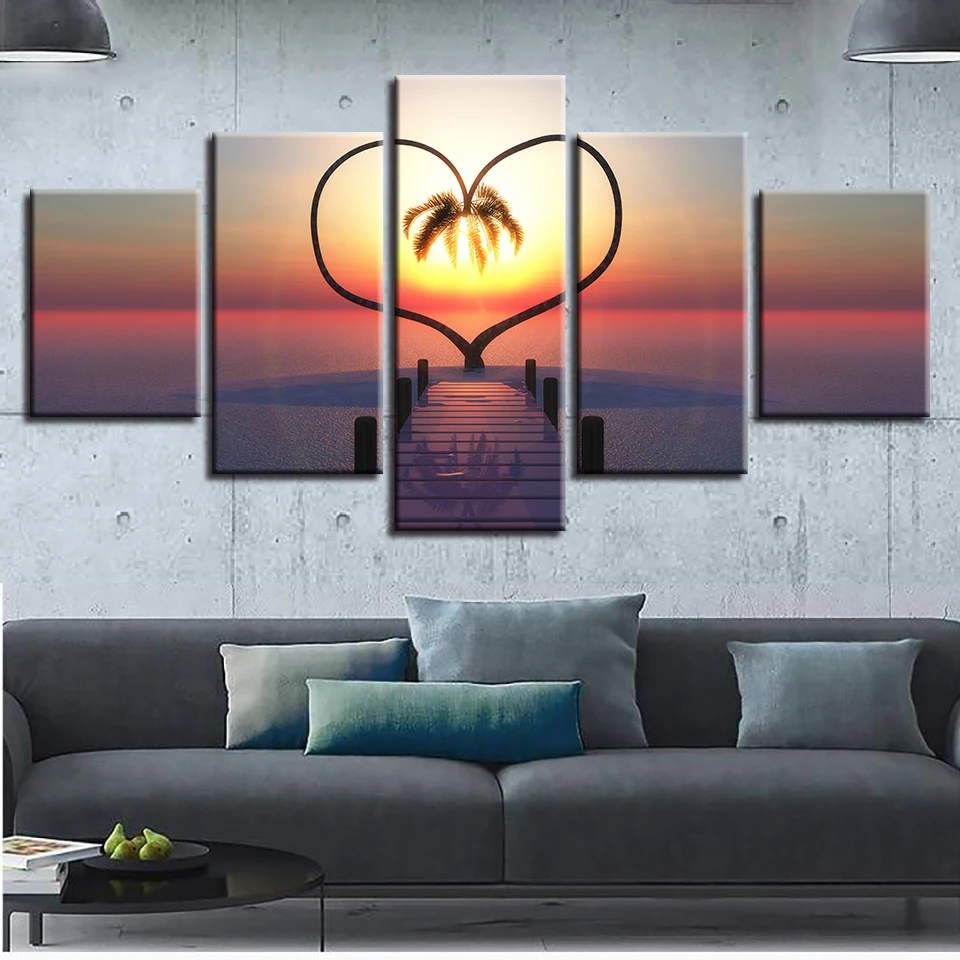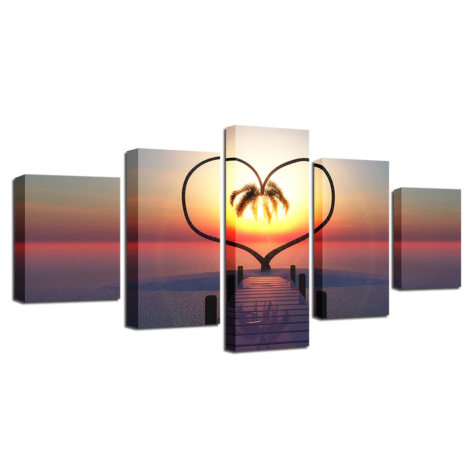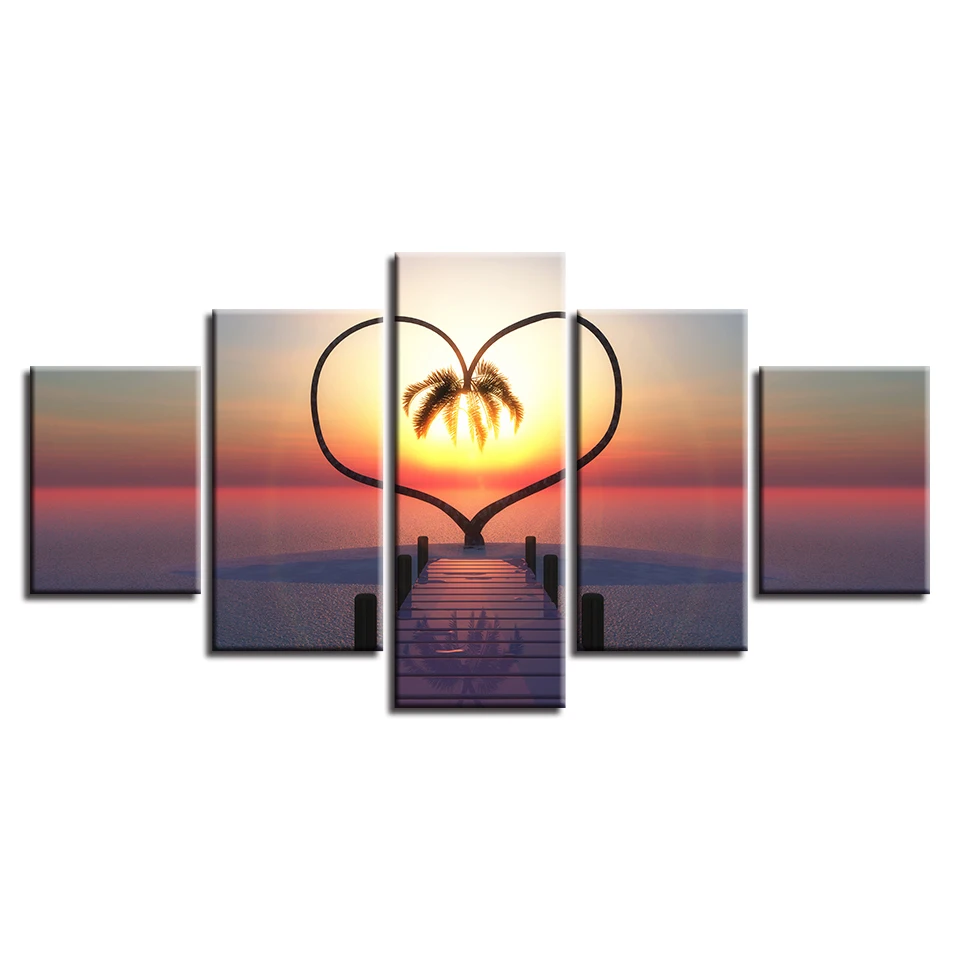 Настенные художественные печатные картины, Декор для дома, рамка, 5 шт., картины с изображением океанских сердец, деревьев, рассвет, мост, пейзаж, холст, модульный постер
