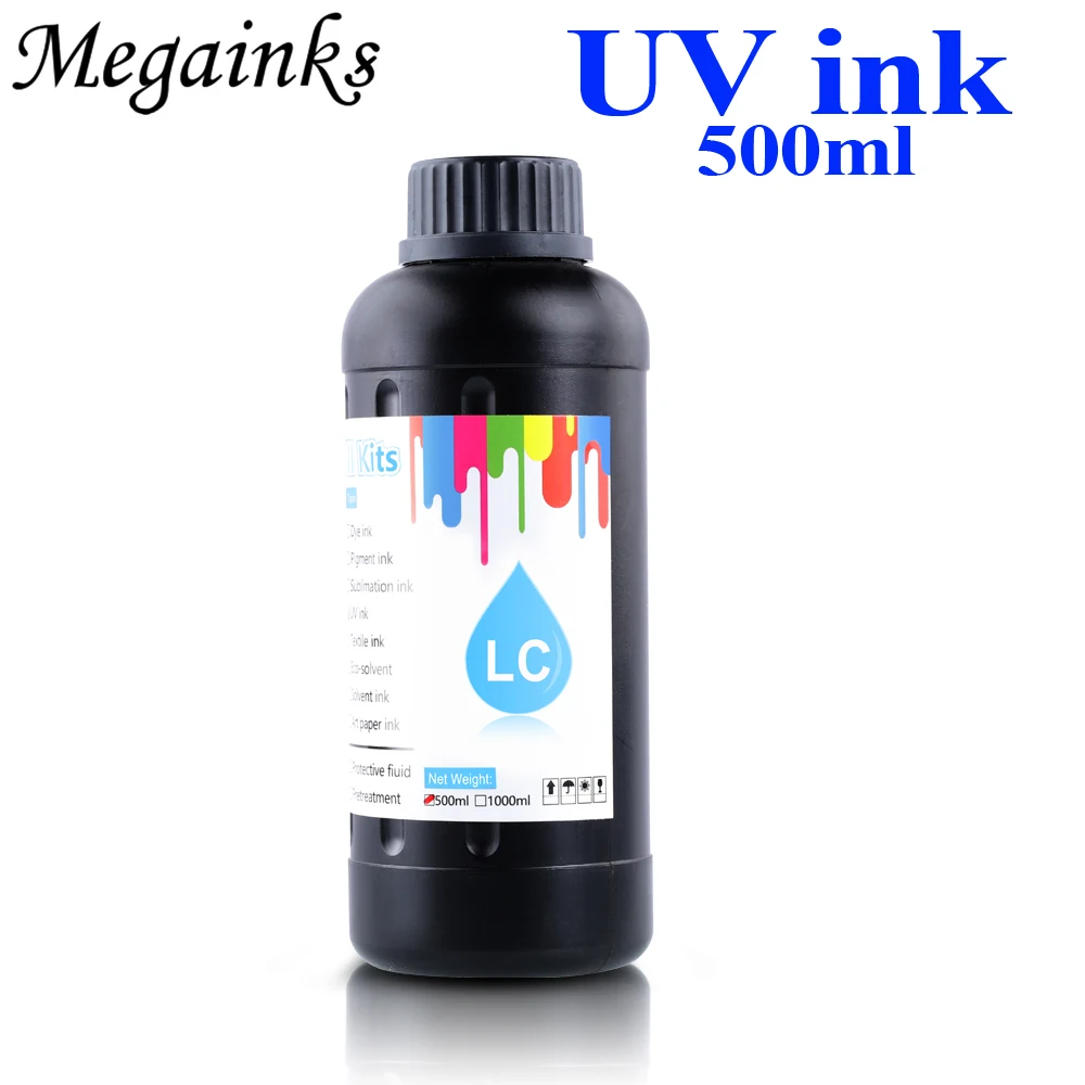 Название бренда: MegainksЦвет: BK C M Y WH LC LMОбъем: 500 мл на бутылкуTpye: жесткие УФ-чернилаПодходит для: длина волны 395нм, 365нм