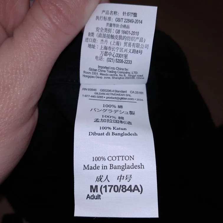Футболка по качеству очень приличная, производства Бангладеш. В этой стране хлопок отличного качества, пришлось несколько месяцев там прожить. Пошив без вопросов. Боковых швов нет. Принт наклейка, причём не совсем приятная, блестит. Как поведёт после стирки сложно сказать. Размер 3 икса на 54 в самый раз. На рост 185 см длина нормально, не короткая. Доставка долгая.