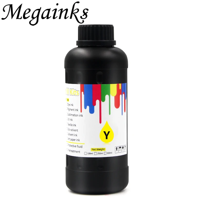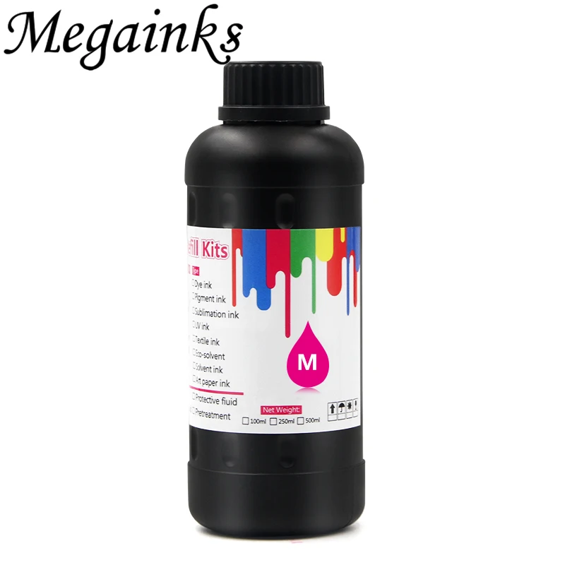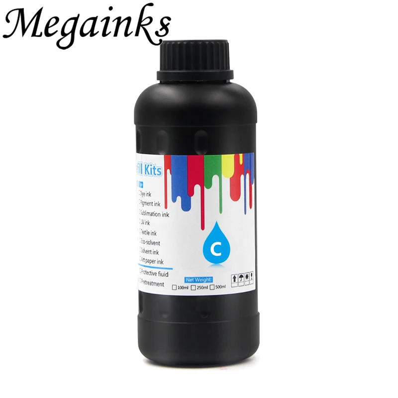 Производитель: megainks Цвет: BK C M Y WH LC LM Объем: 500 мл на бутылку Tpye: мягкие УФ-чернила Подходит для: длина волны 395нм, 365нм