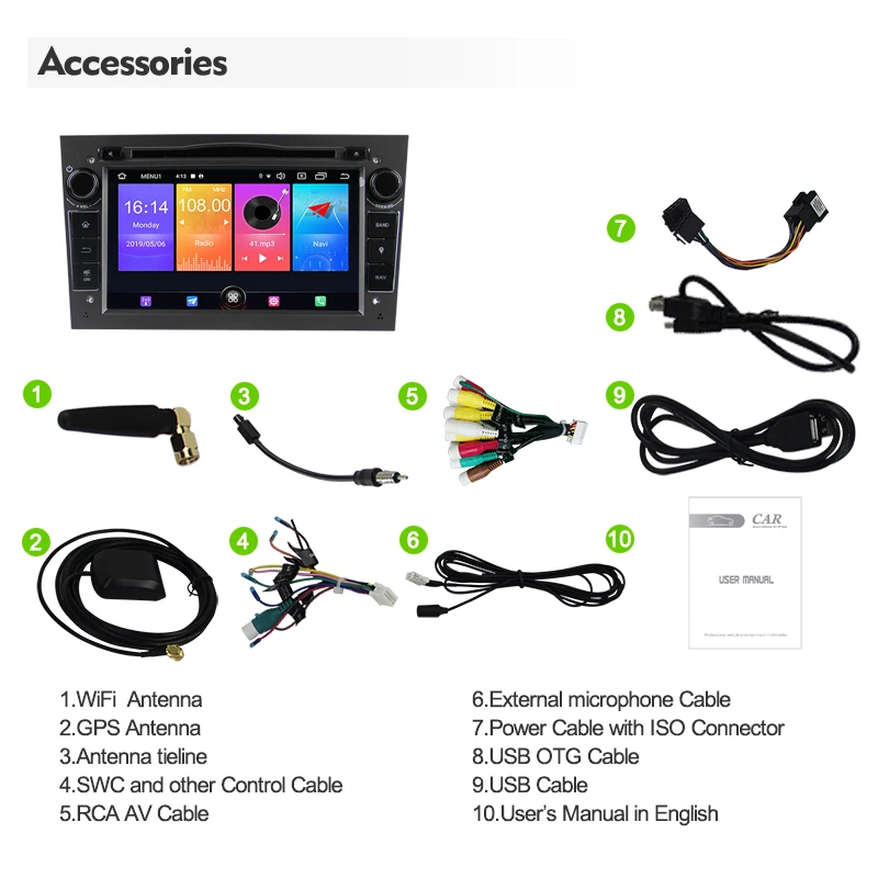 DVD / GPS / Bluetooth/Радио/RDS/Встроенный Wi-Fi / Mirror-Link / 3G / 4G / DSP/Встроенный CarPlay / USB / SWC / AUX in/Games/встроенная Can-шина/8-цветная Кнопка видеосъемки: аудиовход камеры: AUX1 Видеовыход: video1/video2 аудиовыход: FL/FR/RL/RR/сабвуфер версия BT: 4,0
