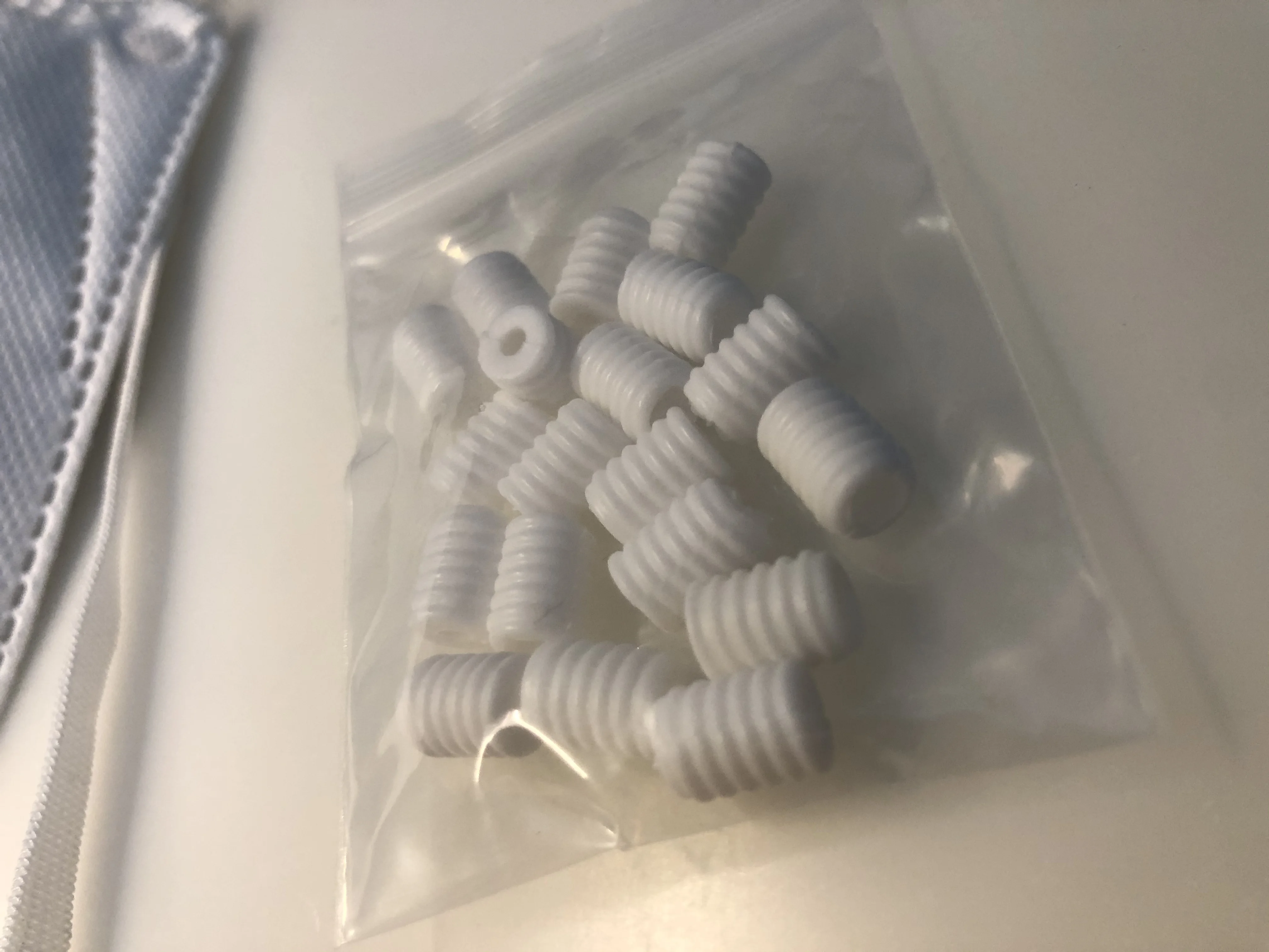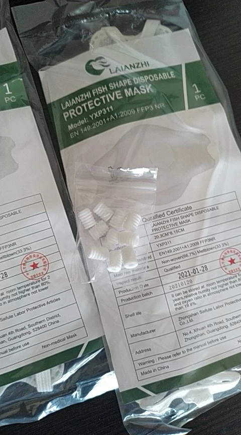 Немного отличается фото упаковки масок, хотя это никак не влияет на качество :-) один большой пакет с клипсой внутри него маски каждая запаянная в свою индивидуальную упаковку. Посадка очень удобная, мягкая фиксация на носу и самое классное что крепление НЕ ЗА УХИ :-) Единственное не понял что за пакетик с маленькими цилиндрами с резьбой на них :-(