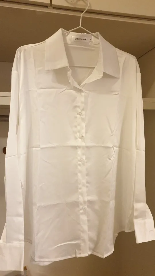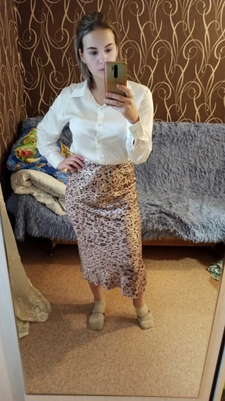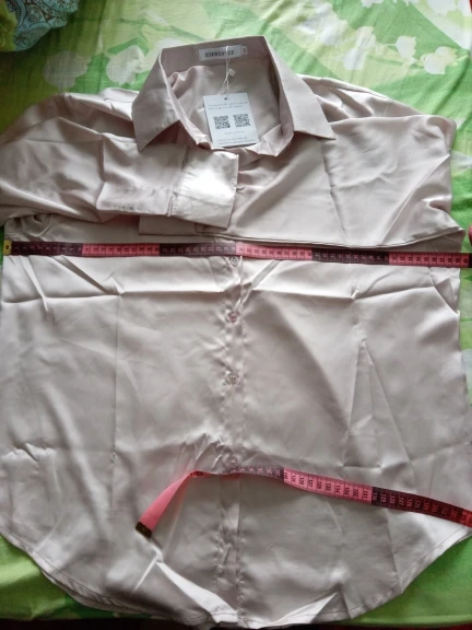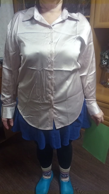 Рубашка просто отличная, ткань гладкая и приятная к телу. Продавец очень общительный, помогал с выбором и консультировал в других вопросах. Рубашка сидит отлично, размерная сетка соответствует, но я хотела чтобы сидело немного оверсайз, поэтому по совету продавца взяла размер М. Ткань электризуется, но это неудивительно зимой для синтетической ткани. Пользуюсь антистатиком. Немного торчали нитки, но я их отрезала и все. Цвет соответствует картинке продавца.