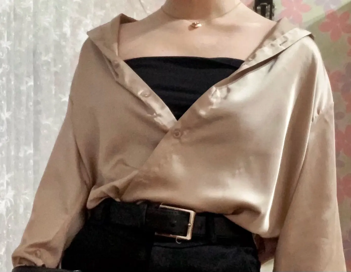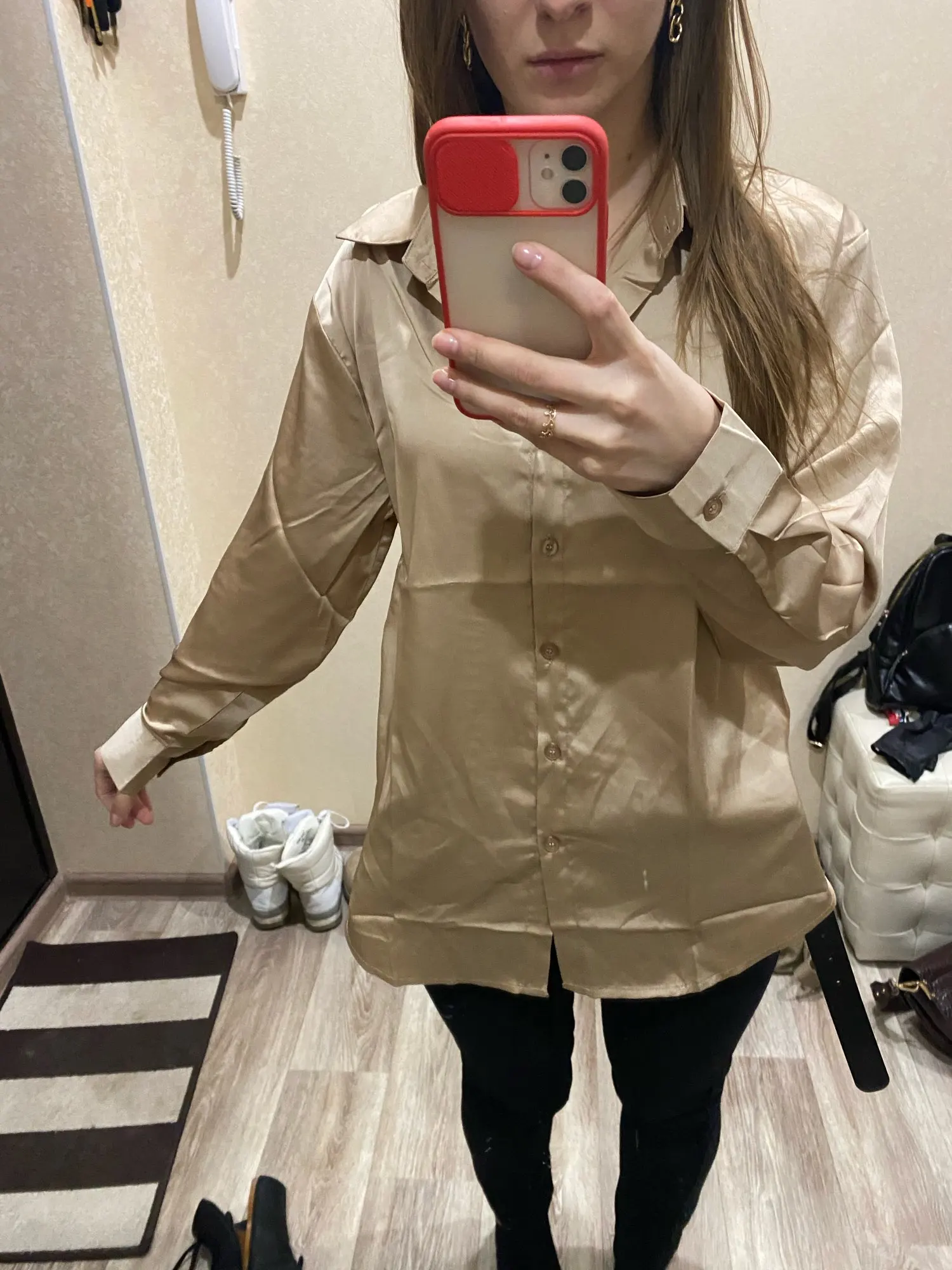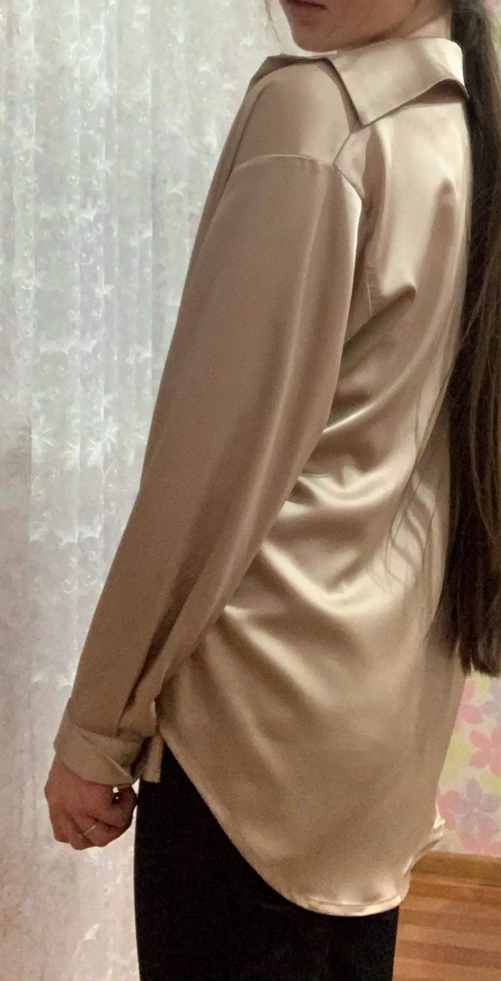не ожидала, что за 700 рублей получу такую красивую блузку! на свой российский XS заказала позицию M, чтобы было оверсайз. в жизни этот цвет больше похож на розовое золото, камера передаёт чуть другой оттенок. да, конечно, есть ниточки, но не составило труда их отрезать. сперва она не очень понравилась, но когда погладила, села шикарно. немного блестит материал, тонкий, легко оставляются зацепки, поэтому девочки, аккуратно с кольцами. гладится легко, мнётся не очень сильно. из-за доставки plus пришла за 11 дней!!! спасибо продавцу за блузку :)
