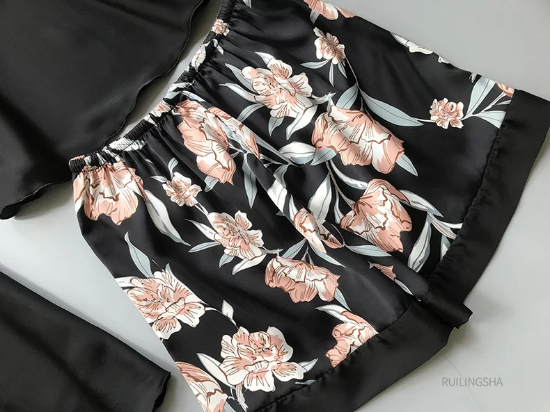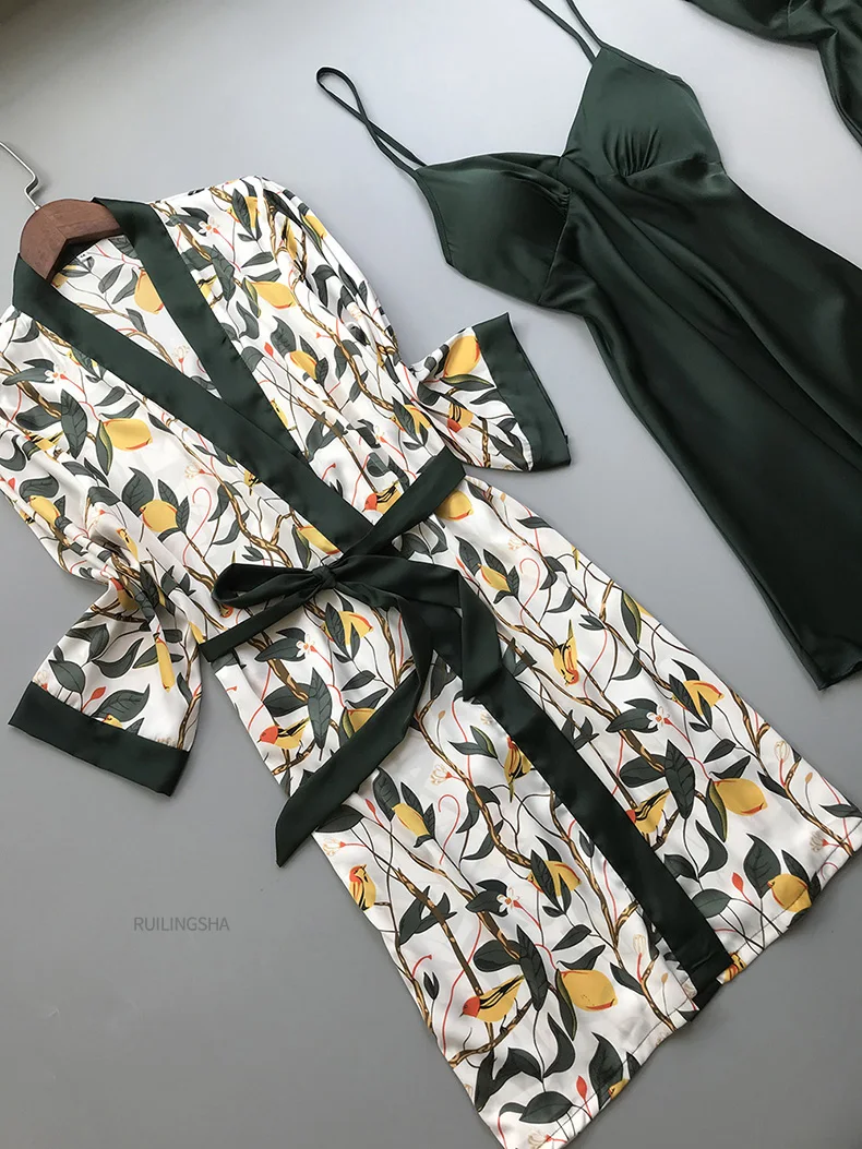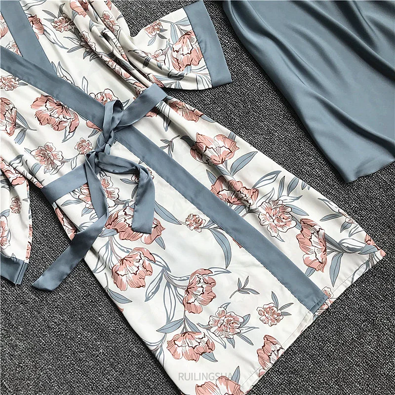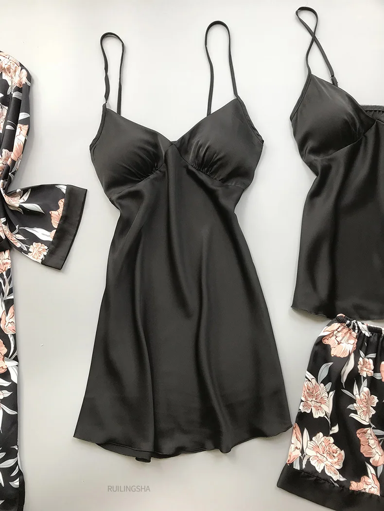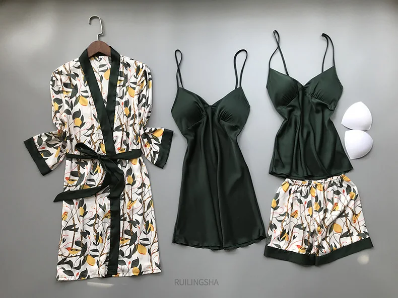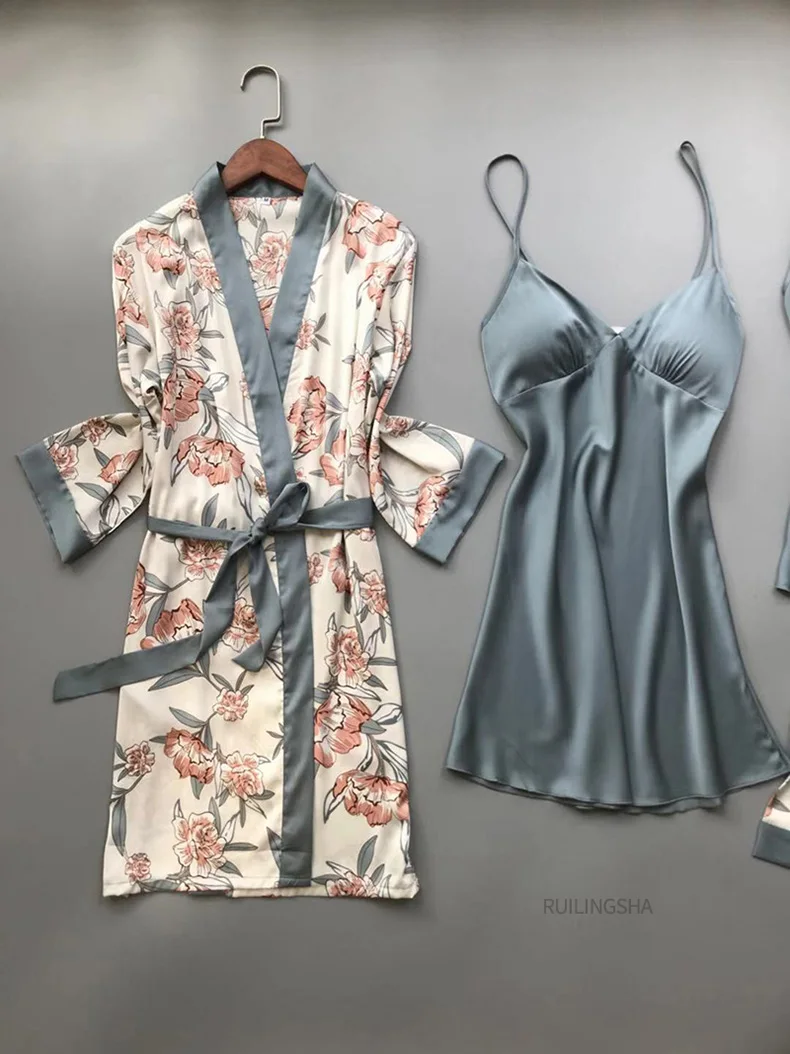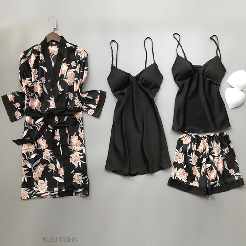 Пижамный комплект женский Шелковый из 4 предметов, одежда для сна с цветочным принтом, кимоно, атласная пижама, нижнее белье, Элегантная ночная рубашка, размера плюс